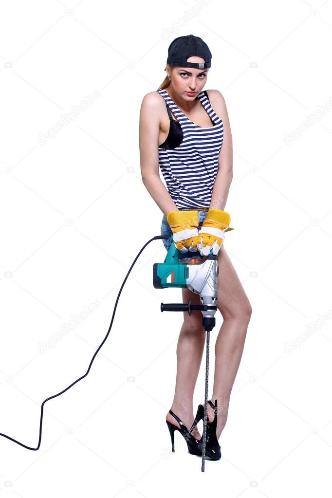 Eine sexy Bauarbeiterin mit einer Schraubenpistole . . .