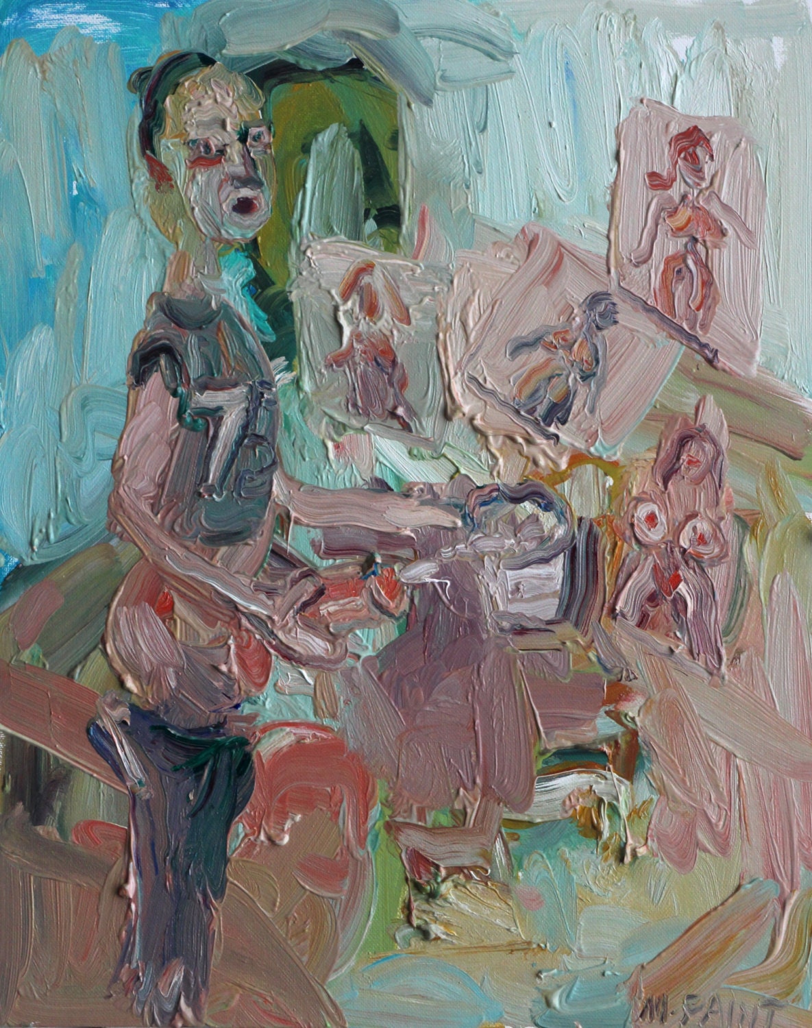 Vector Cartoon of Ugly Deformed Man Walking with Cup in to Sperm Bank. Vector cartoon stick figure drawing conceptual illustration of ugly and deformed man