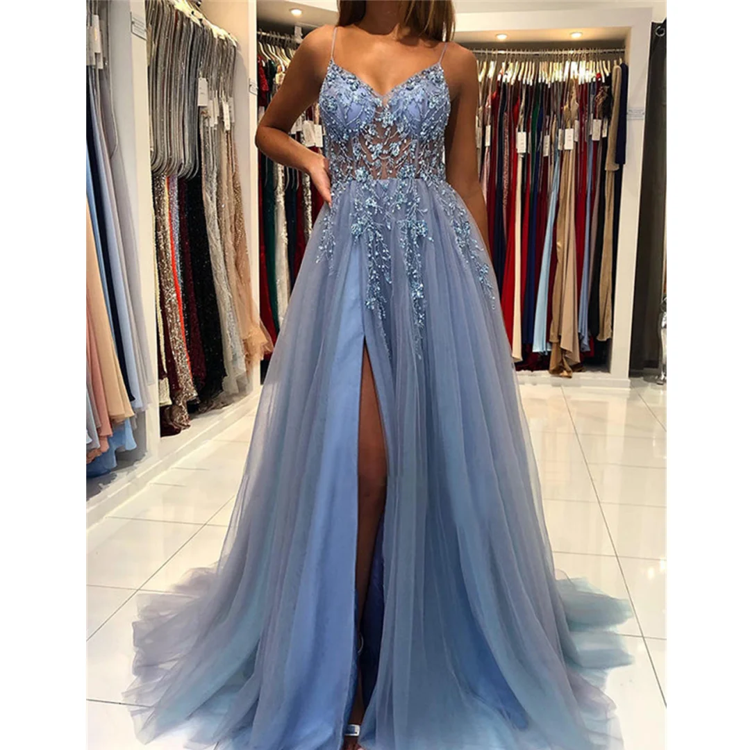 DnYeUvnsrLooked for Sexy Spaghetti Straps Blue Tulle Evening Dresses 2023 New V-Neck Rhinestones Beading Formal Prom Gowns with Slit robe de soiree for a long time, but could not find it? Bring to your attention Sexy Spaghetti Straps Blue Tulle Evening Dresses 2023 New V-Neck Rhinestones Beading Formal Prom Gowns with Slit robe de soiree with the best price!