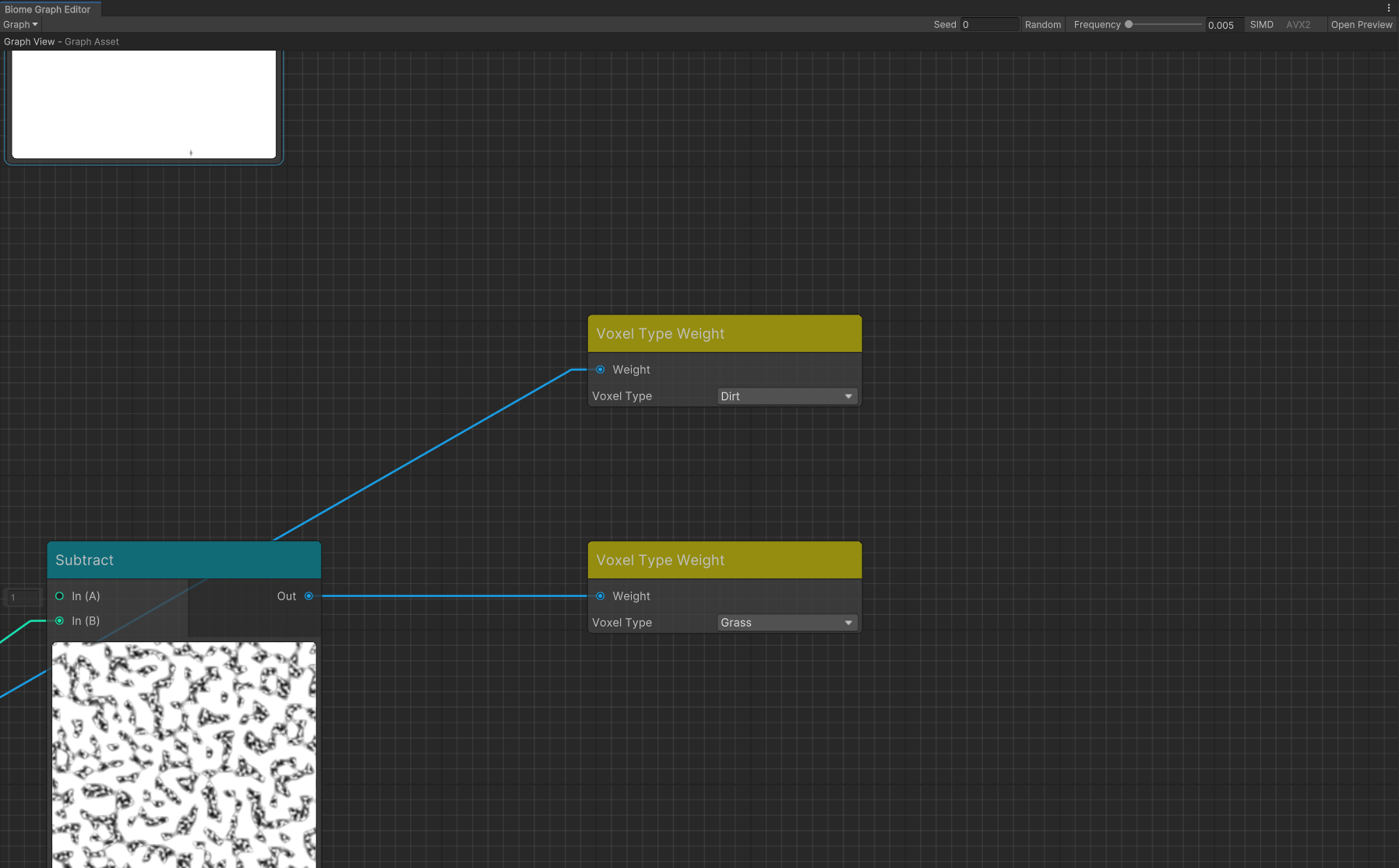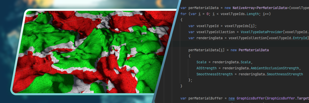 Когда я генерирую ландшафт мне необходимо оценить каждый воксель, который потенциально может содержать поверхность. Вместе с генерацией SDF значения и его градиента можно еще оценить и потенциальный материал. На этом этапе материал представляет из себя просто идентификатор, который точно определяет к какому биому (набору типов вокселей и правил генерации) он относится и к какому конкретно типу вокселя из этого биома.