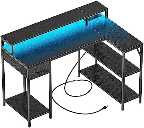 "Shaped Gaming Desk with LED Lights & Power Outlets, Reversible Computer Desk with Shelves & Drawer, Corner Desk Home Off" * Buy Now With Free Shipping Just For $146