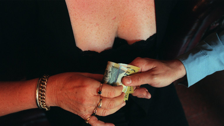 We made chitchat briefly as I tried to think of a cool way to bring up giving her a wad of cash I had in an envelope because she was a prostitute and I was a john . Luckily she was on top of that like stink on a monkey and had her tiny purse on the bar before I figured out what I wanted to say and suggested I just slide my donation inside .