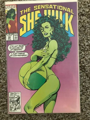 A nude She-Hulk is the best marketing campaign to sell her book . Great job with the colors and muscle tone . This theme originally done by John Byrne done in the 80's is one of the best used today . I like the arm sleeves to match her bikini .