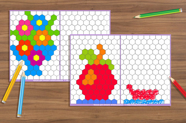 Распечатайте пустой шаблон для мозаики, разрежьте на части, на одном листочке нарисуйте свой собственный цветной рисунок и предложите ребенку повторить рисунок . После того как малыш выполнит задание, можно использовать картинки как образец и по образцу сложить из обычной пластмассовой шестиугольной мозаики соответствующую картинку .