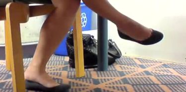 I caught the same woman from the first part in the library again, and once again popping her feet out in nice tan sheer nylons and showing a lot of sole and toes . I really enjoyed filming this one, and I hope she goes to the library again . Lots of dangling and shoeplay as well .