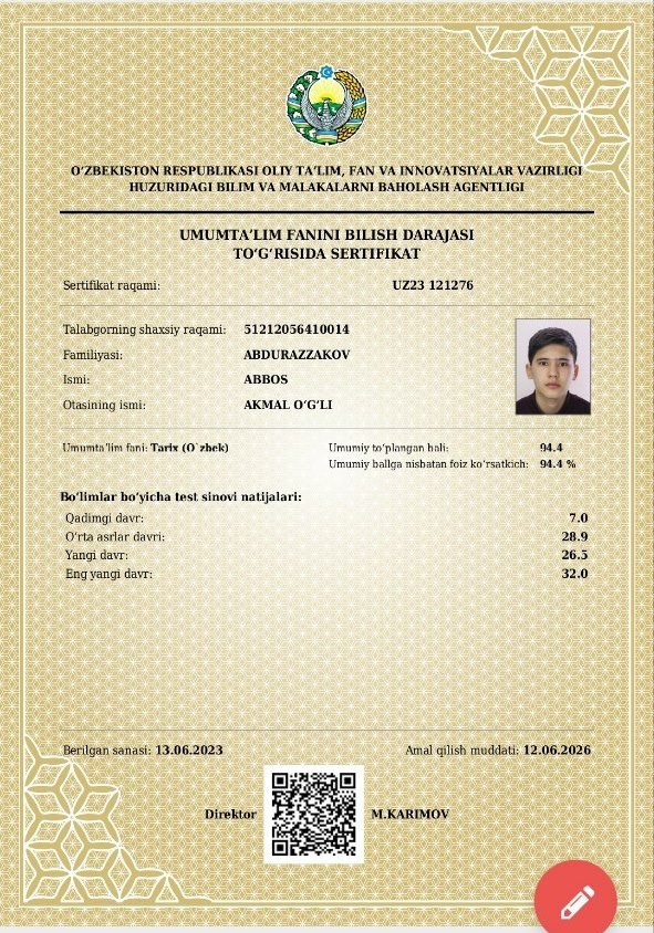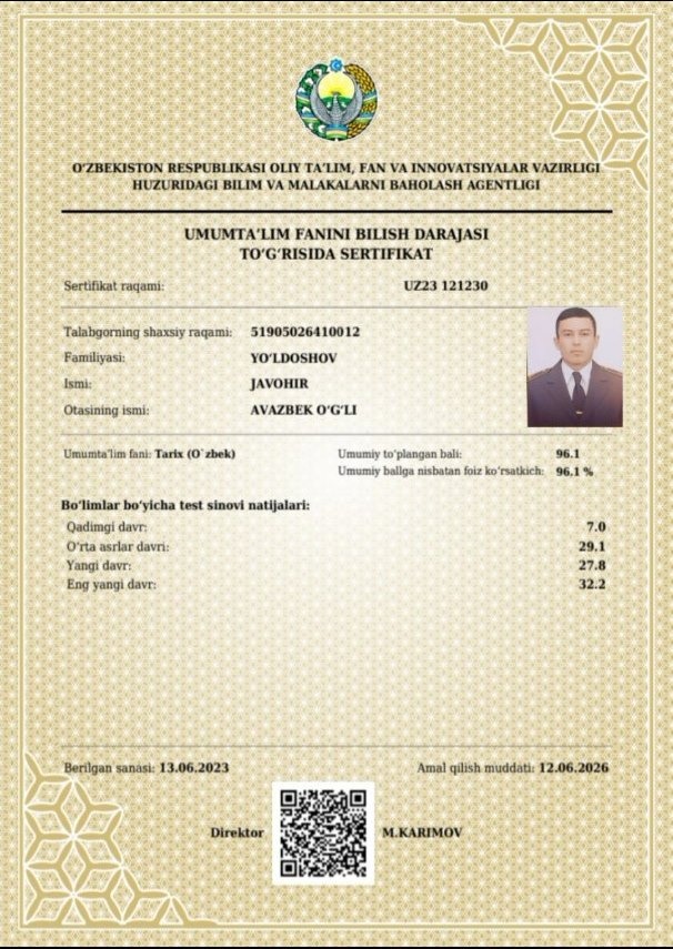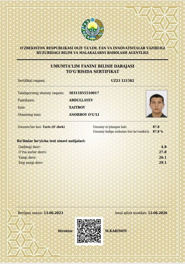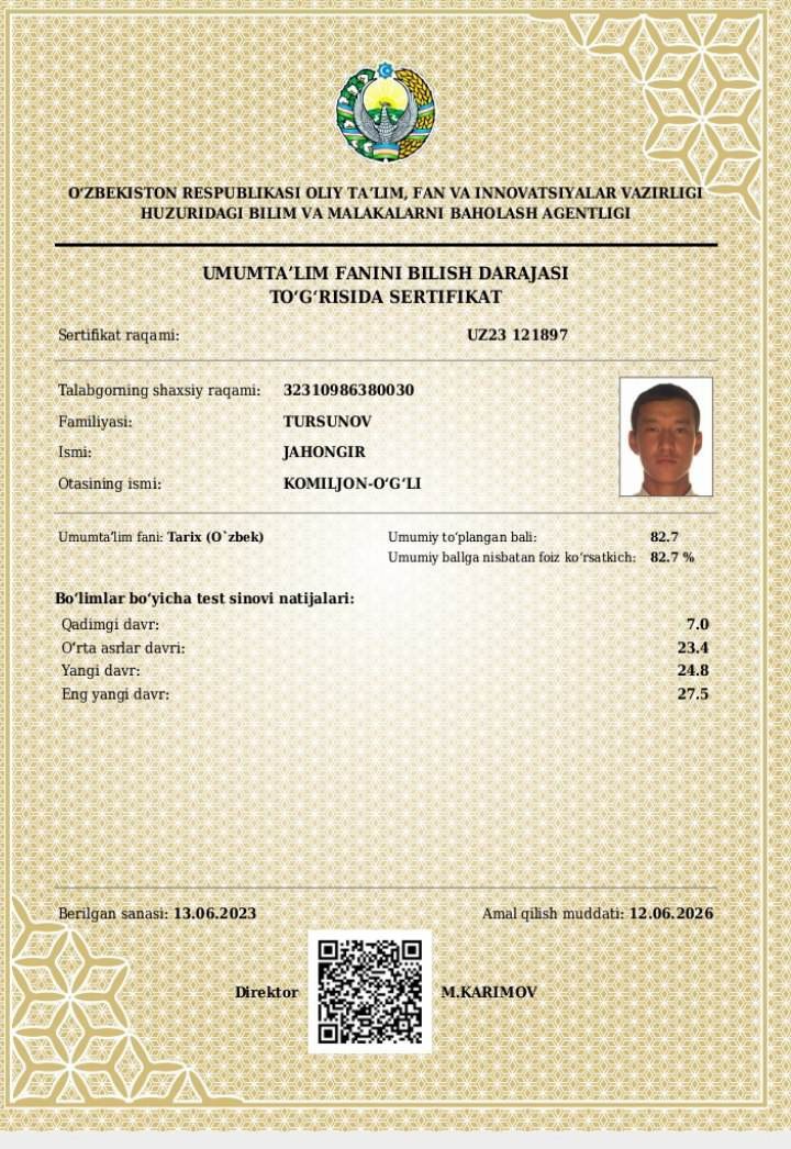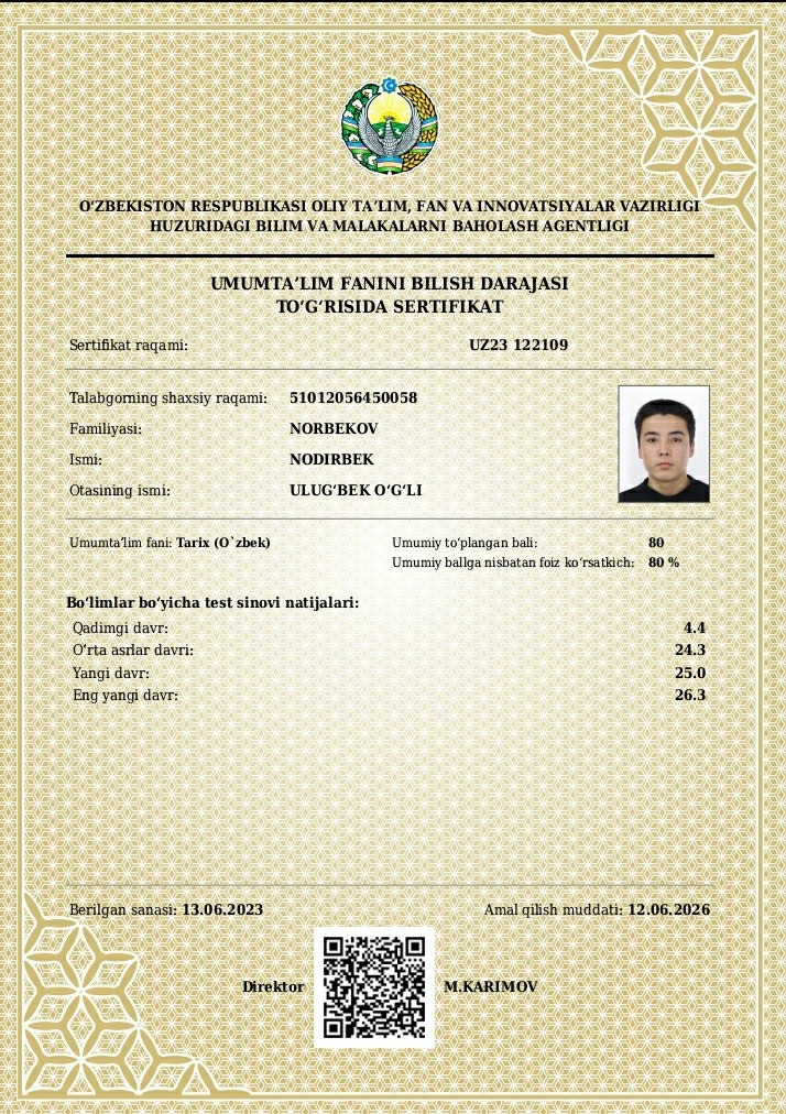 Shogirdlar natijalari bu yerdaNavruz Norbo'tayev shogirdlaridan Tarix fanidan milliy sertifikat natijalariYo'ldoshov Javohir: Foiz ko'rsatkichi - 96.1%Norbekov Fayzullo: Foiz ko'rsatkichi - 94.8 %Abdurazzoqov Abbos: Foiz ko'rsatkichi - 94.4 %Abdullayev Hayitboy: Foiz ko'rsatkichi - 87.8 %Tursunov Jahongir: Foiz ko'rsatkichi - 82.7 %Norbekov Nodirbek: Foiz ko'rsatkichi 80 %
