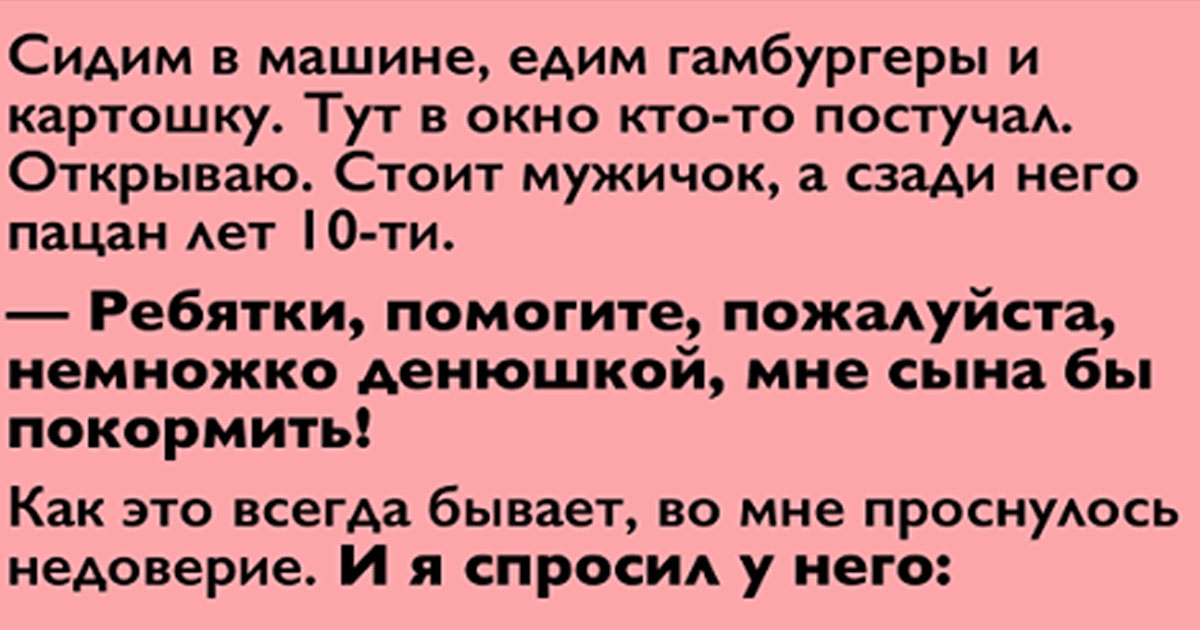 Глубокая ночь . Мы с другом сидим в машине, едим гамбургеры и картошку из Макдональдса . Тут в окно кто-то робко постучал . Открываю .