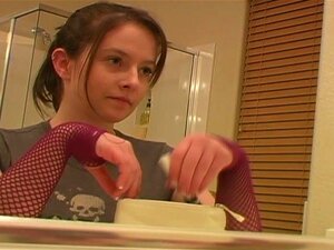 Brunette teen bohrt Ihre enge vagina mit übergroßen dildo