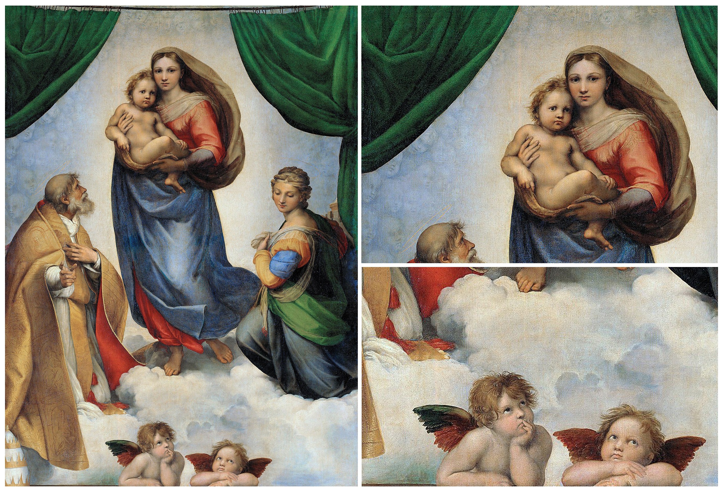 Даже Папа Римский, Сикст Второй, неуверенно показывает пальцем, обращая внимание Богоматери на твое присутствие, и лишь Святая Варвара скромно потупила взгляд на ангелков.