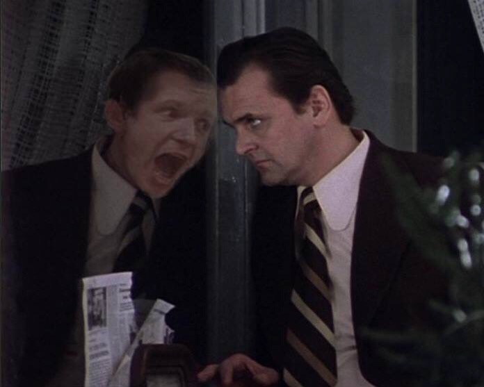 С концовкой тоже не совсем ясно. Но мне нравится вариант, в котором Женя, открыв дверь на очередной звонок, остается снаружи, и не может попасть внутрь- он превращается в выдуманного Ипполита, пока другой, параллельный Женя за дверью наслаждается обществом Нади и заливной рыбой. И тогда он садится в машину, тогда вылетает на лед Невы, и кружится в снегу, улетая в зимнее Никуда- чтобы с боем часов исчезнуть.