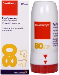 Цена на Симбикорт турбухалер 4,5+80 мкг/доза 60 доз порошок для ингаляций дозированный в Москве - 1093 рубля . Инструкция по применению для Симбикорт турбухалер 4,5+80 мкг/доза 60 доз порошок для ингаляций дозированный .