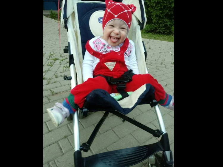 Ксюша - веселая, активная девочка . Она может стоять у опоры и передвигаться за руку, иногда сама подает руку, чтобы ее водили .