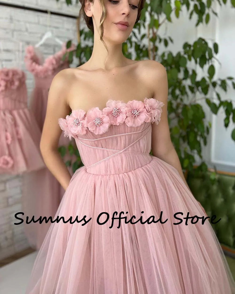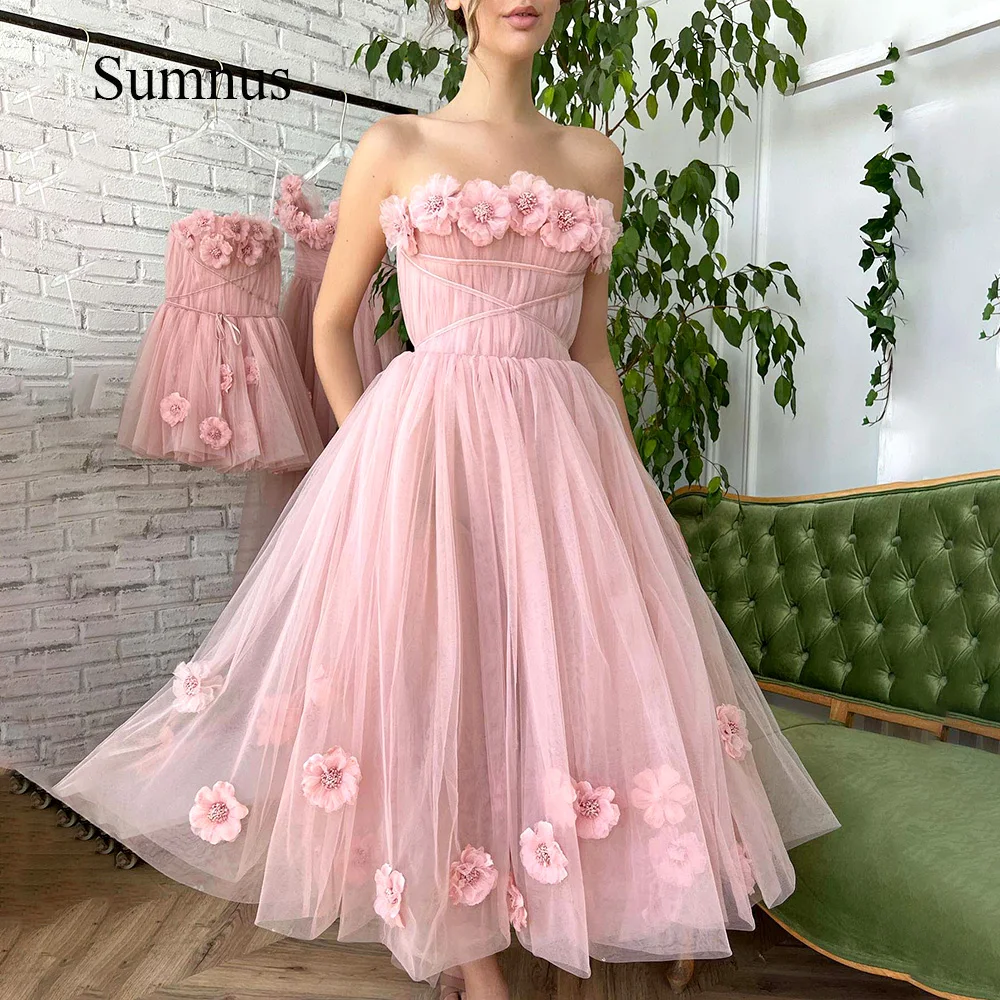 "Simple Pink Tulle Tea Length Prom Dresses Strapless Handmade 3D Flowers A-Line Party Dress 2022 Midi Princess Evening Gowns" * Buy Now Just For 75$