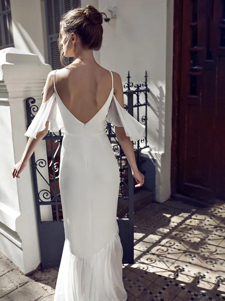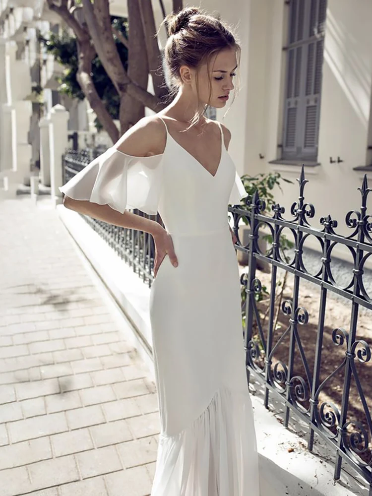 «Simple Spaghetti Straps V-Neck Short Sleeves Mermaid Wedding Dress 2022 Modern Backless Boho Beach Bridal Gown Custom Made» по лучшей цене на рынке! Всего за 106$ (10070рублей)