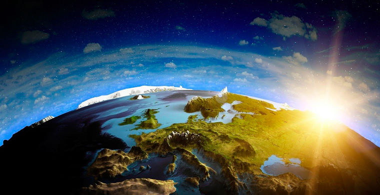 Солнце спряталось за планету . Земля, вид с космоса . Красивые белые звезды . Неопознанная даль . Синее и фиолетовое сияние . Чудесные космос на картинке . Множество планет . Наша планеты и звезды .