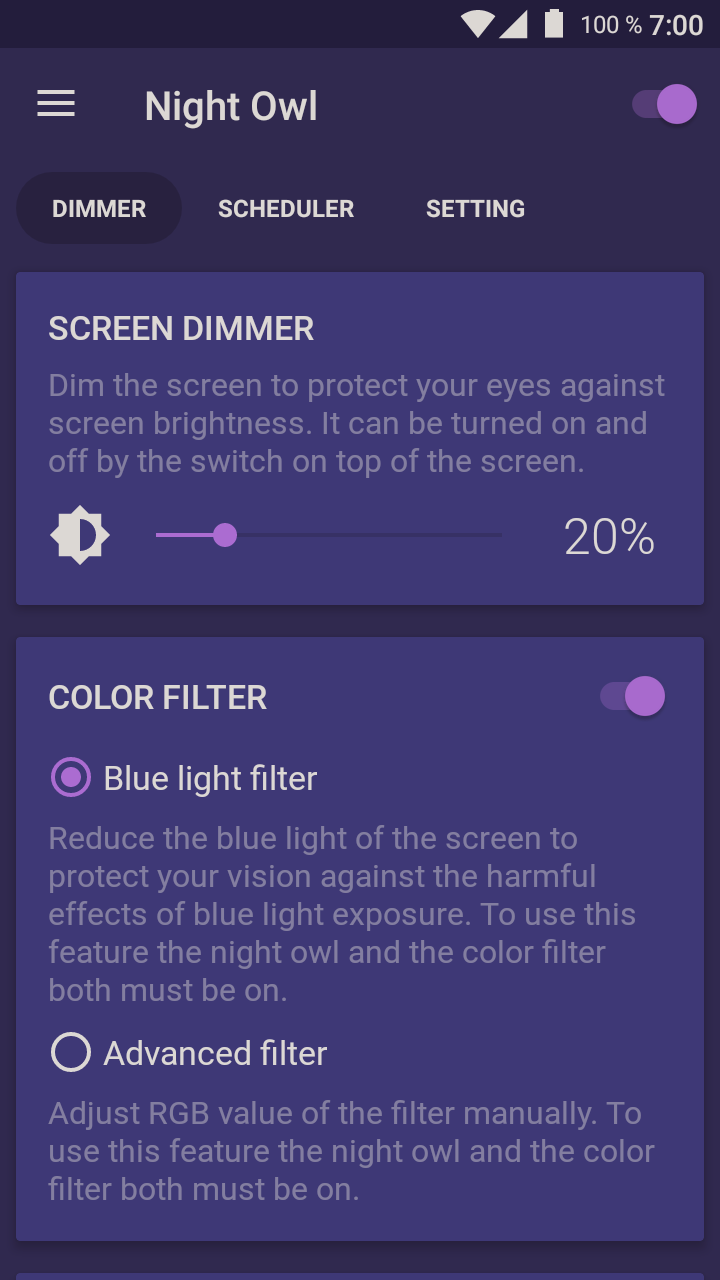 With auto start and auto end options, you can configure app to activate screen filter during night automatically . ☆ Features: Dark screen filter to reduce blue light . Full control over screen filter intensity . Protects your eyes from screen light . Save power-battery by reducing screen blue light . Auto start and end options to start night mode . . .