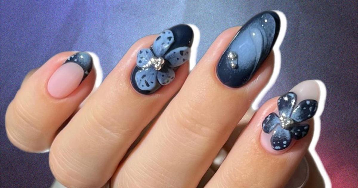 Синий Маникюр С Цветами Фото 149 фотографий