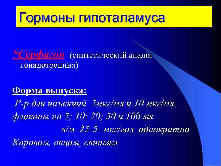 Синтетические гонадолиберины — нафарелин, гозерелин, гистрелин, лейпрорелин — аналоги гонадотропин-рилизинг-гормона — содержат d-аминокислоты в положении 6 и этиламидзамещающий глицин в положении 10 .