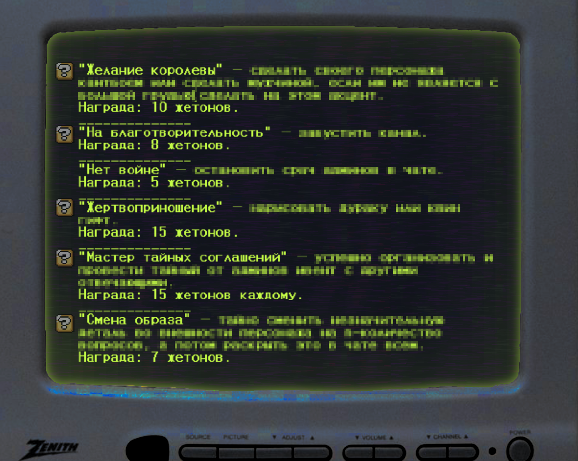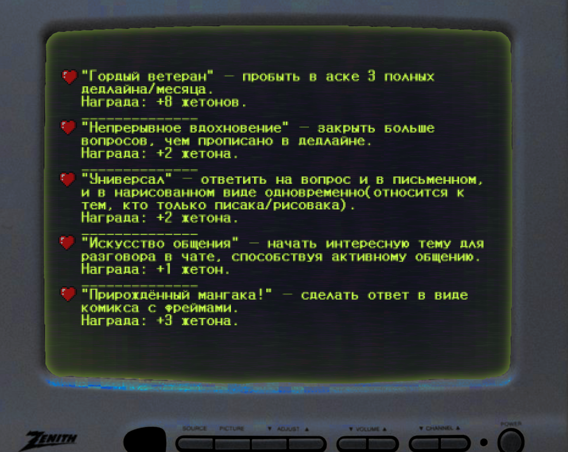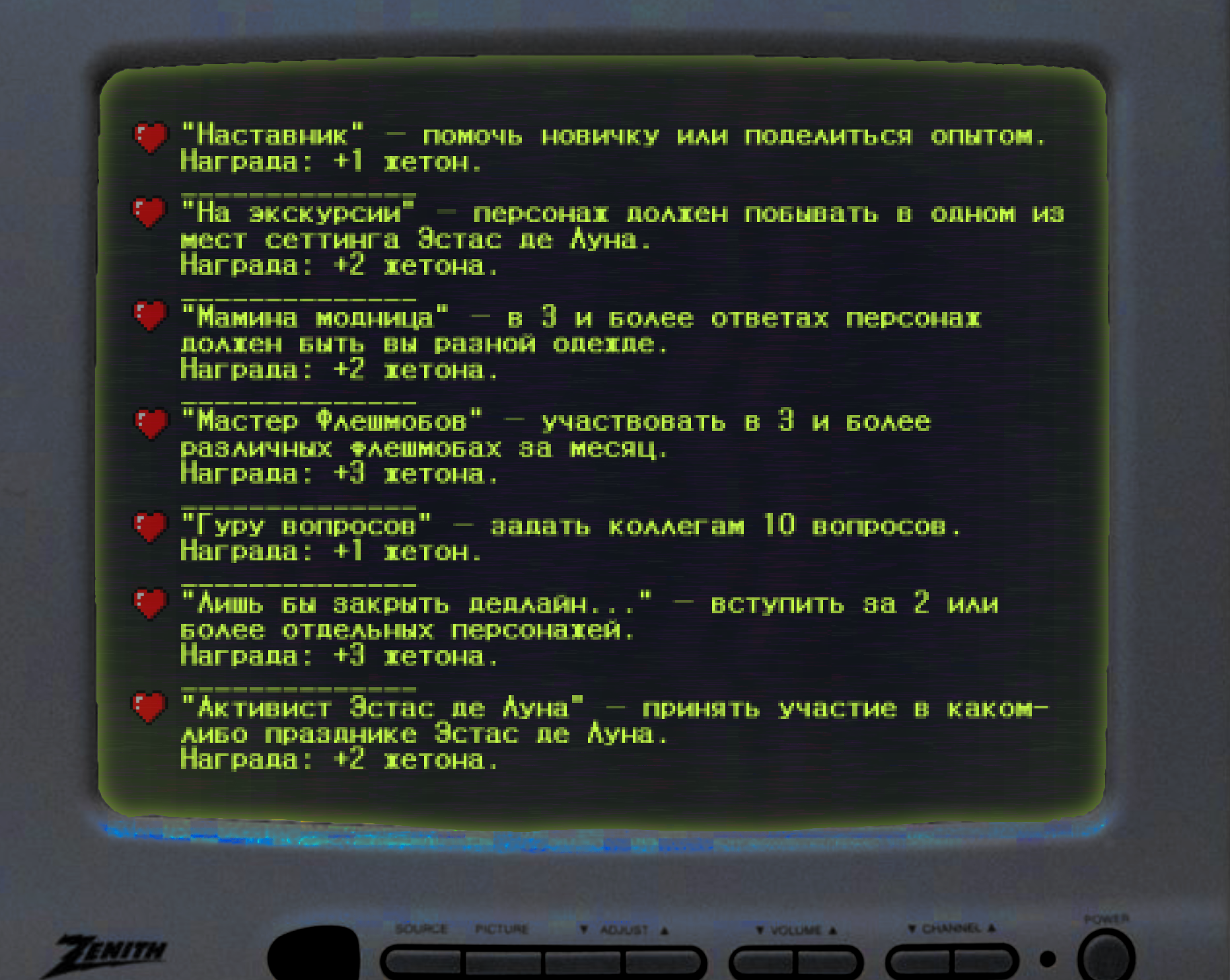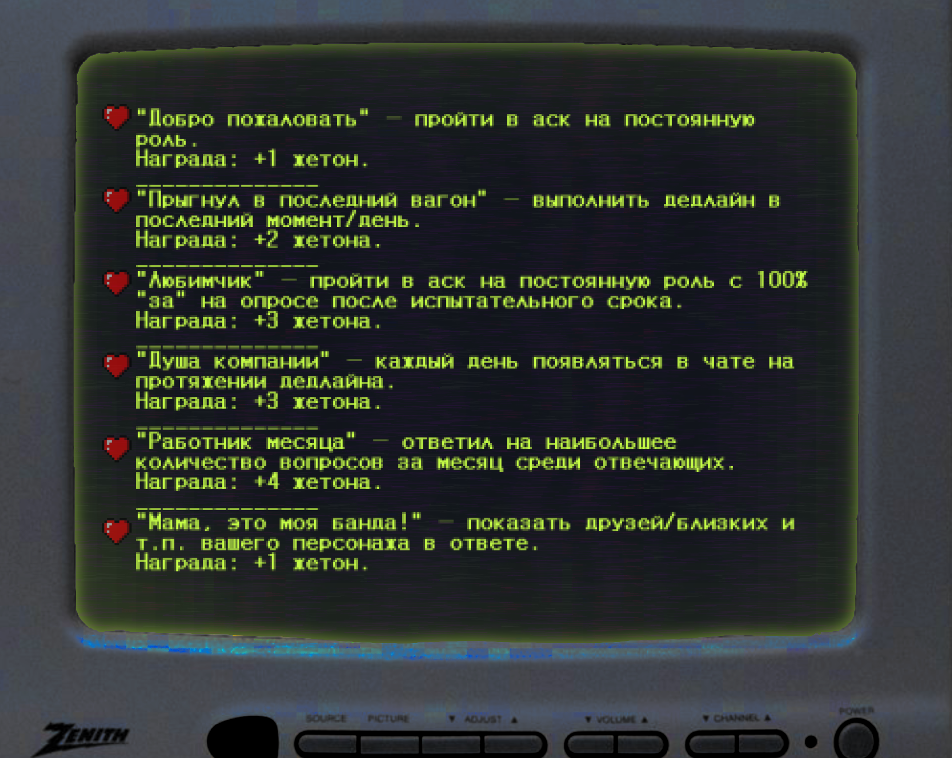 Ачивки.Минусовые ачивки, при которых у вас будут отнимать жетоны.Секретные ачивки! Описание ачивок размыто, так что попробуйте догадаться, что вам нужно сделать!Магазин. Здесь вы можете обменять свои жетоны на плюшки от администрации.
