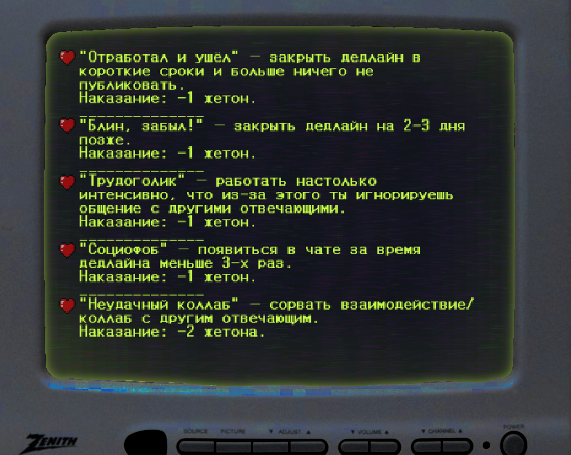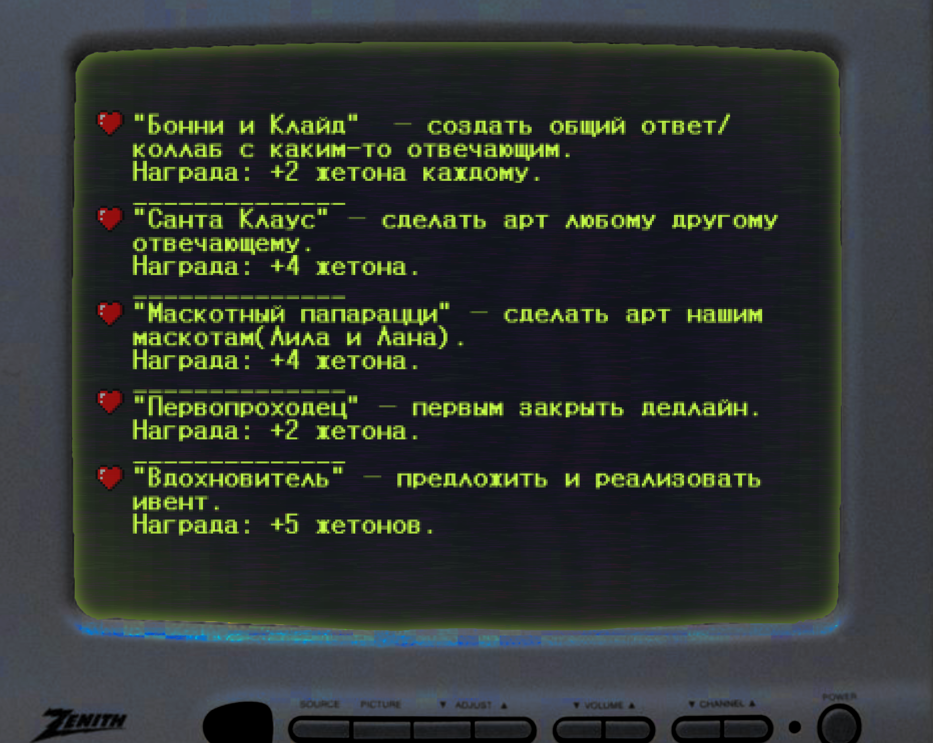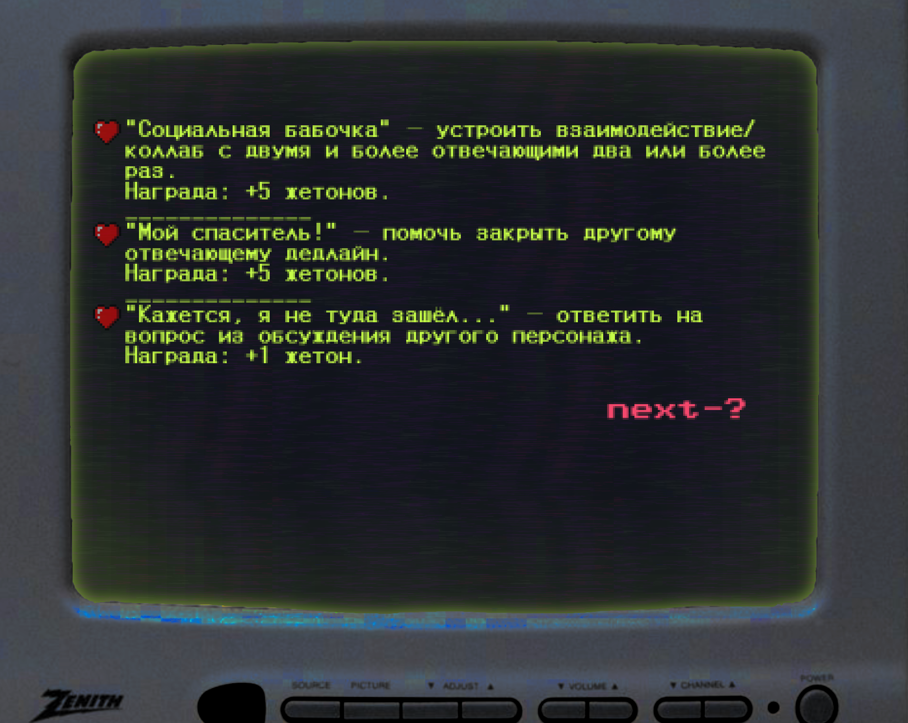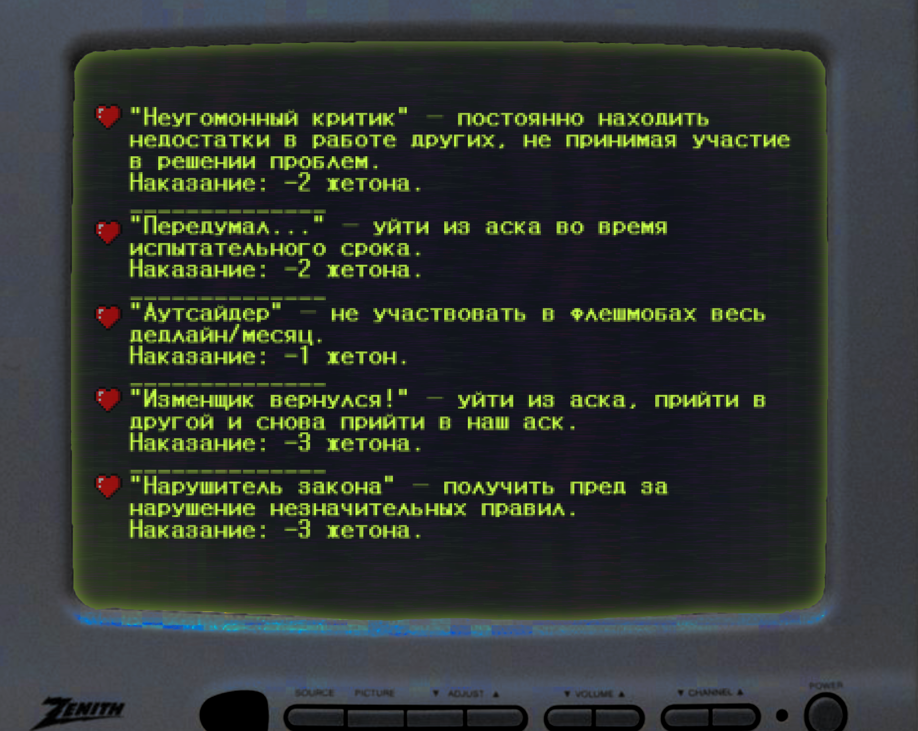 Ачивки.Минусовые ачивки, при которых у вас будут отнимать жетоны.Секретные ачивки! Описание ачивок размыто, так что попробуйте догадаться, что вам нужно сделать!Магазин. Здесь вы можете обменять свои жетоны на плюшки от администрации.