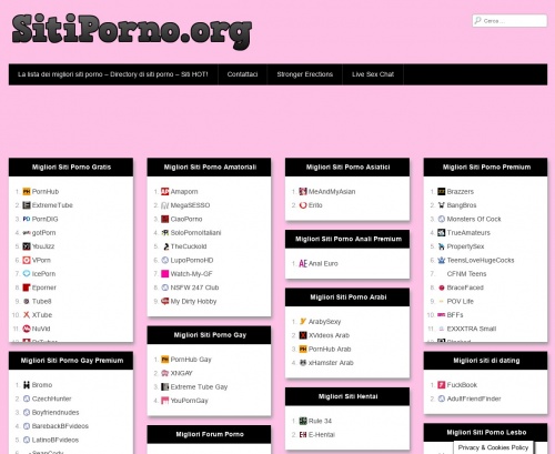 PornHD Porno HD ti porta gratis HD Porno . Xhamster A chi importa dei nomi di dominio? YouPorn Questo è il sito che ha iniziato l'hype dello streaming video nel settore degli adulti . Fap18 Fapping = Masturbarsi . PornHub Pornhub è molto più; Redtube Per qualunque cosa sia chiamato "rosso" Tube8 Il famoso sito porno con il logo a otto sfere .