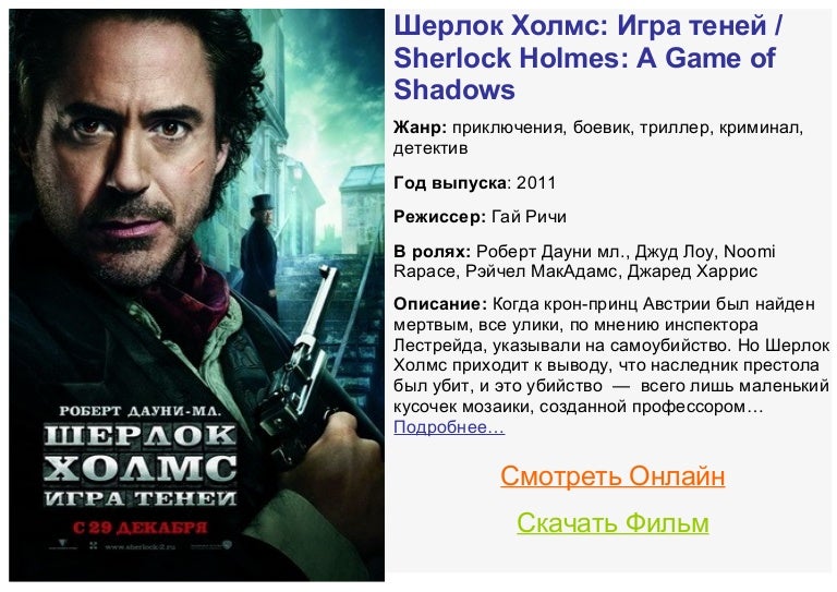 Шерлок Холмс: Игра теней ( 2011 ) скачать торрент в хорошем качестве бесплатно . Боевик, приключения, триллер . Режиссер: Гай Ричи . В ролях: Роберт Дауни мл ., Джуд Лоу, Нуми Рапас, Джаред Харрис и др . Загрузка .