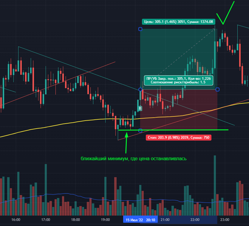 СЛ– Размещаем под ближайший минимум, где цена останавливалась.