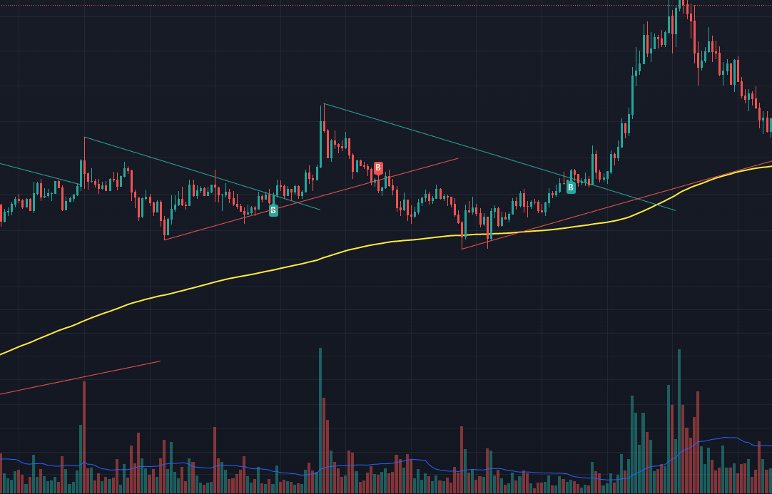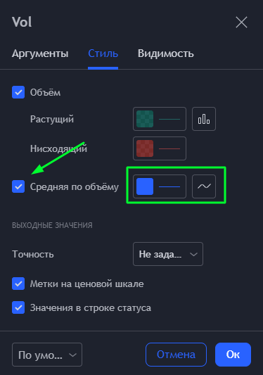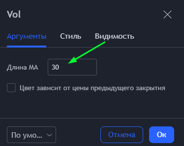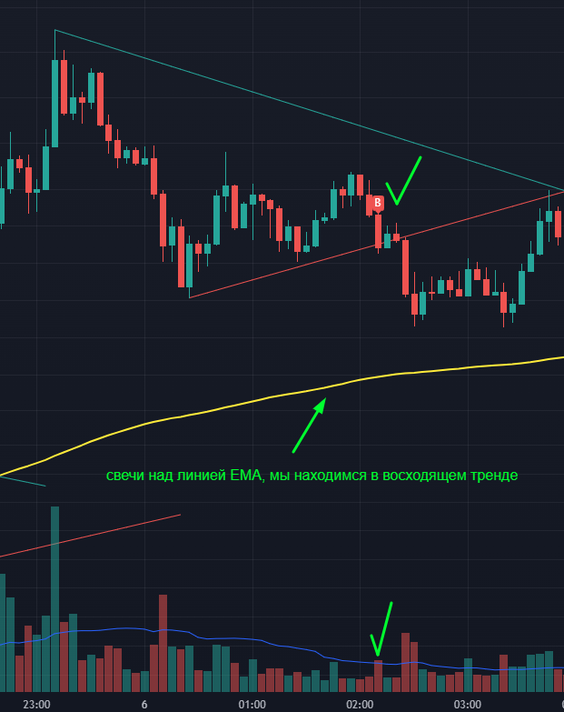 Индикатор 3 - Столбец объёмов должен пересечь скользящую среднюю (синяя линия на индикаторе)