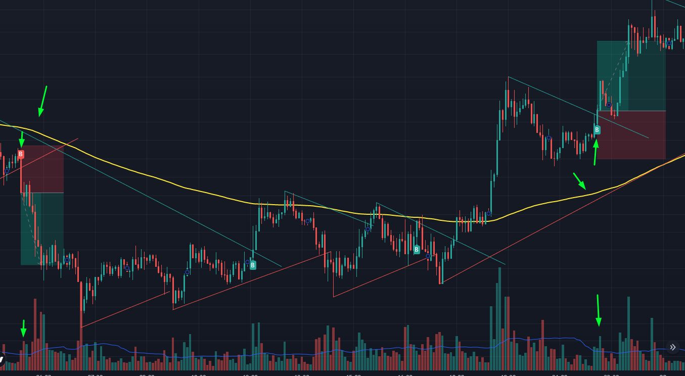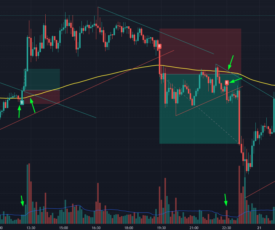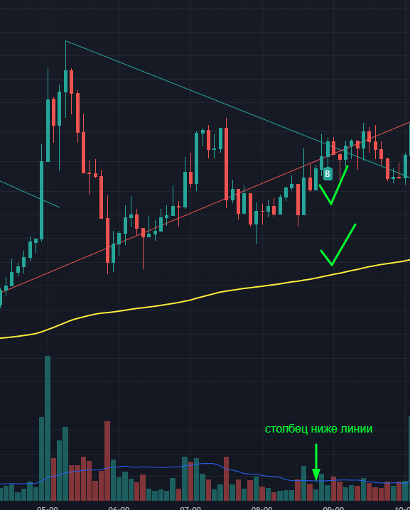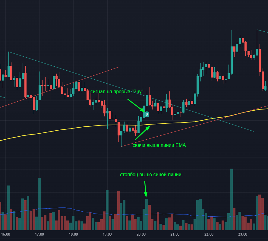 - Обязательно ждём закрытие свечи, на которой появился сигнал. Сигнал на прорыв может исчезать, пока свеча не будет закрыта.