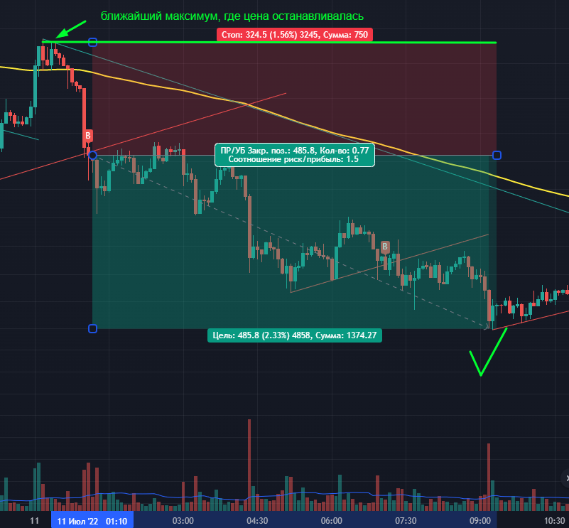 СЛ– Размещаем под ближайший максимум, где цена останавливалась.