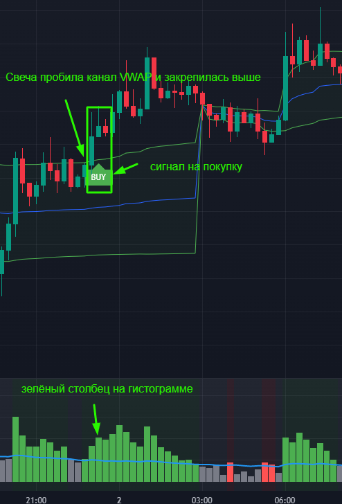 Индикатор 2 – Свеча пробивает канал VWAP / закрыта выше канала