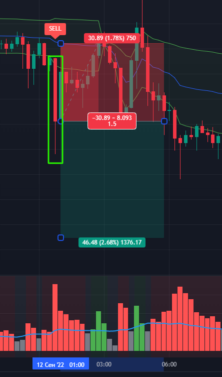 Входим в сделку только после закрытия медвежьей свечи (красной).