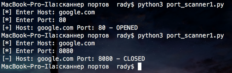 print('[+] Host: ' + host + ' Port: ' + str(port) + ' - OPENED') # Если всё прошло без ошибкок, то выводим, что порт открыт