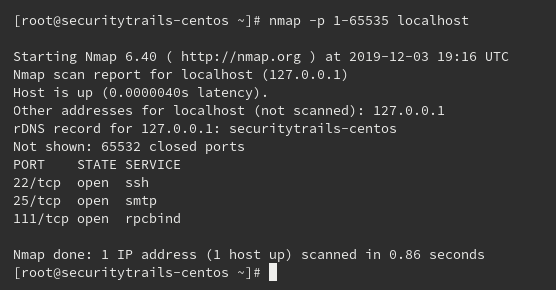 root@securitytrails-ubuntu:~# nmap -p 1-65535 localhost Starting Nmap 7.60 ( https://nmap.org ) at 2019-12-03 19:11 UTC Nmap scan report for localhost (127.0.0.1) Host is up (0.0000030s latency). Not shown: 65534 closed ports PORT STATE SERVICE 22/tcp open ssh Nmap done: 1 IP address (1 host up) scanned in 6.54 seconds root@securitytrails-ubuntu:~#