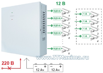 СКАТ-1200 Бастион Источник бесперебойного питания (ИБП): 12 В . Источник вторичного электропитания резервированный . (ИВЭПР): 12 В, 4,5 А, кратковременно и в режиме резерва до 5 А .