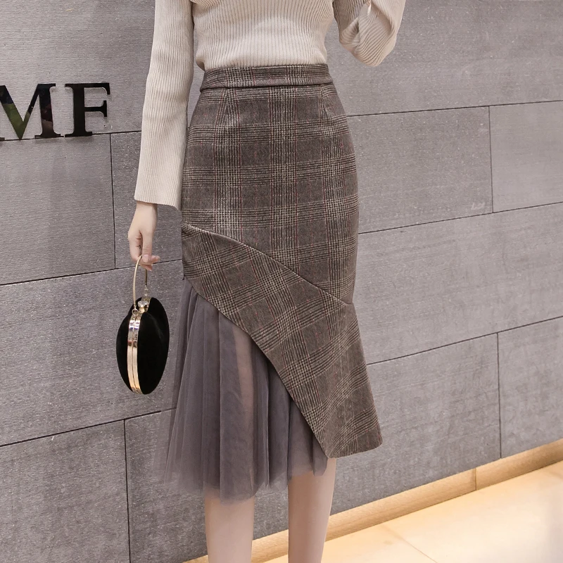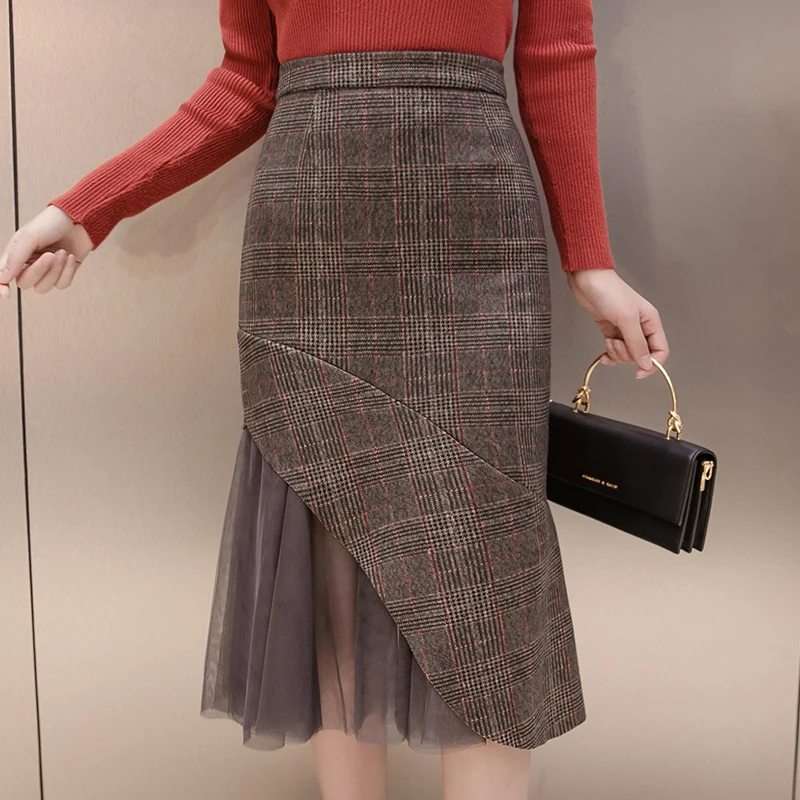 "Skirts Womens 2023 Plaid Sexy Mermaid Woolen High Waist OL Office Lady Skirt Mesh Stiching Skirt Falda" * Buy Now Just For 24$