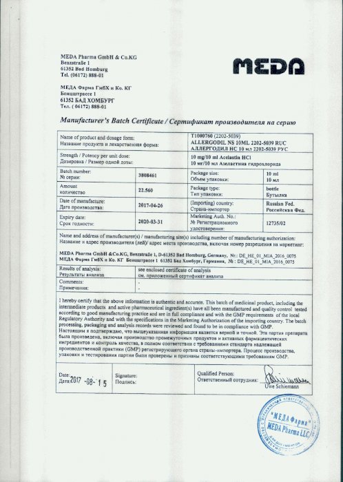 Аллергодил (глазные капли) может использоваться для лечения инфекционных заболеваний глаз только в комплексной терапии по рекомендации врача . Условия хранения препарата . Аллергодил