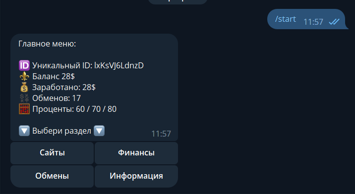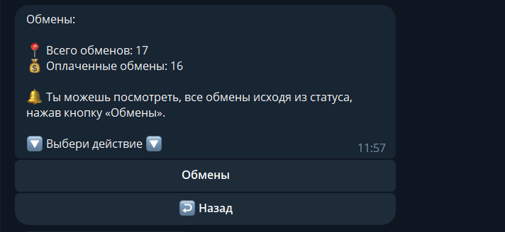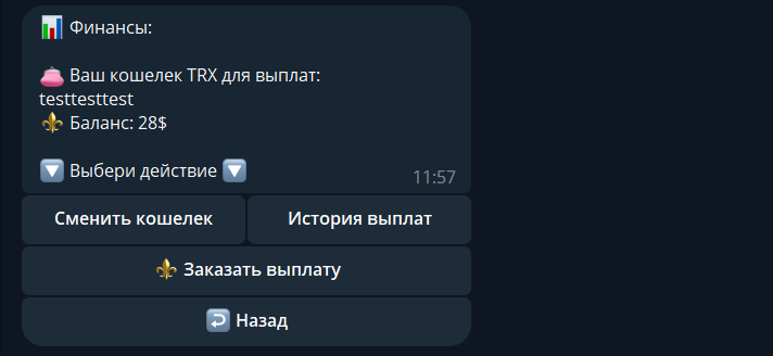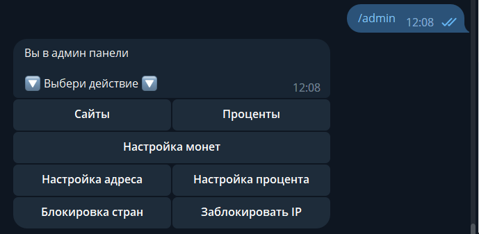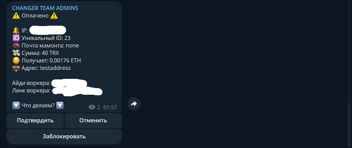 При успешной оплате в админ канал приходит уведомление об оплате и кнопки "Подтвердить" либо "Отменить", после чего мамонту показывает соответствующее сообщение.