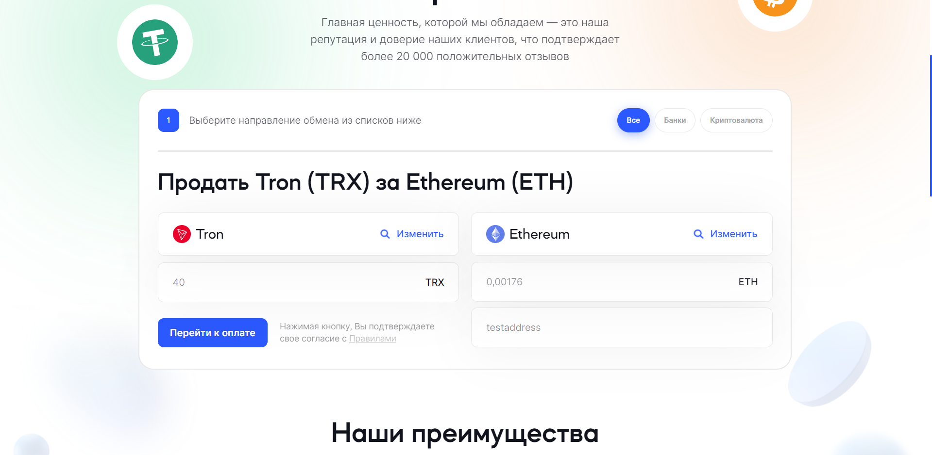 BTC : ETH : ADA : BNB : DASH : DOGE : LTC : XMR : TRX : USDT TRC20 : USDT ERC20 : Tinkoff : Sberbank : Qiwi : VTB : Visa/Mastercard USD