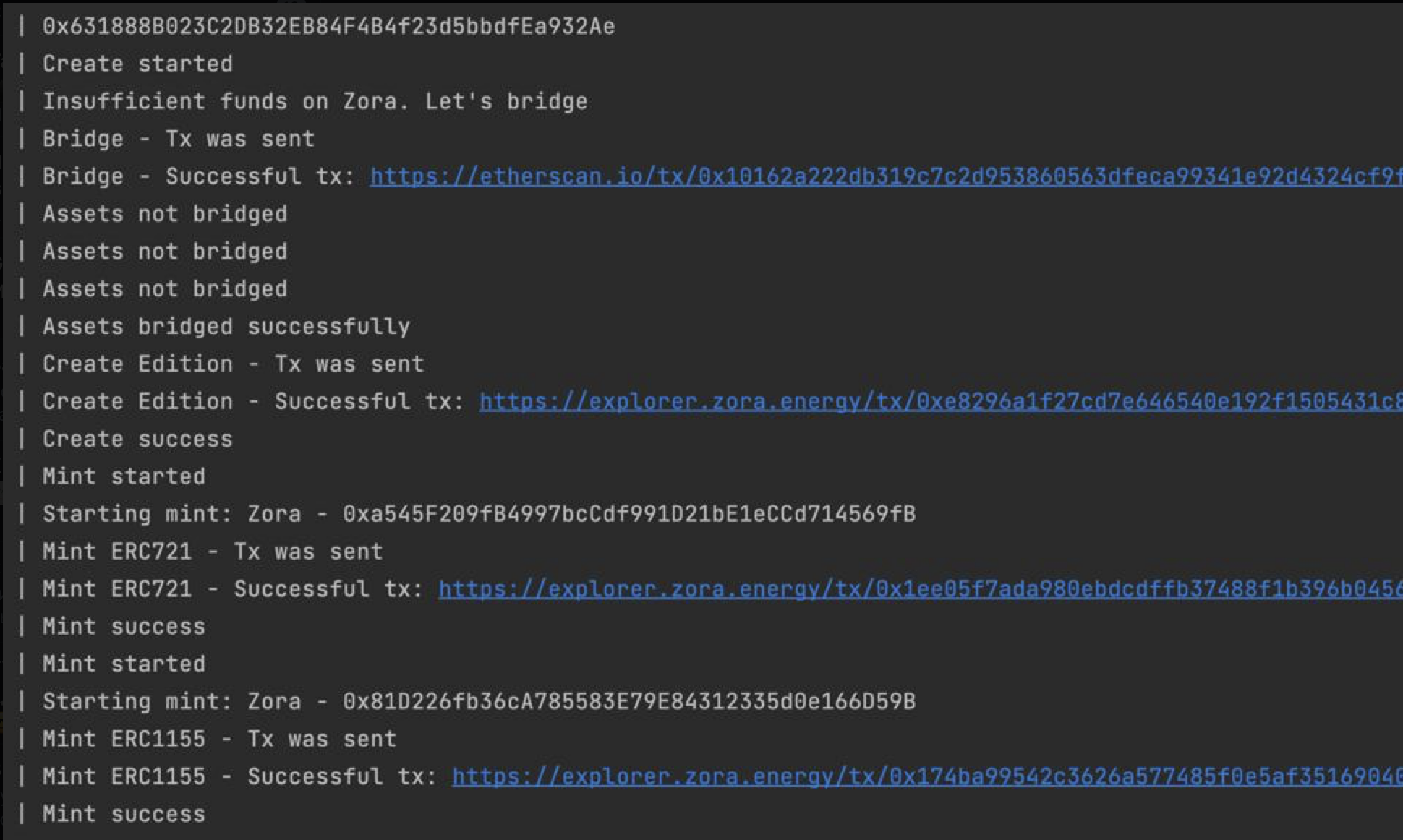 bridge - бриджа ETH из сети эфира в сеть зоры. для выбора суммы ниже есть параметр BRIDGE_AMOUNT. Если включен параметр AUTO_BRIDGE, то при нехватке эфира для оплаты минта или создания, он автоматически забриджится