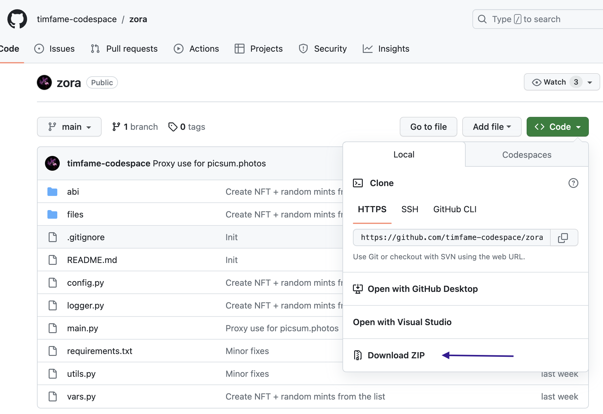 Переходим по ссылке https://github.com/timfame-codespace/zora и тыкаем кнопки Code -> Download zip