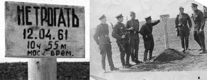 Столб с табличкой «Не трогать! 12.04.61 г. 10 ч 55 м. моск. врем», установленный военными на месте приземления Юрия Гагарина около деревни Смеловка в Саратовской области 12 апреля 1961 года.