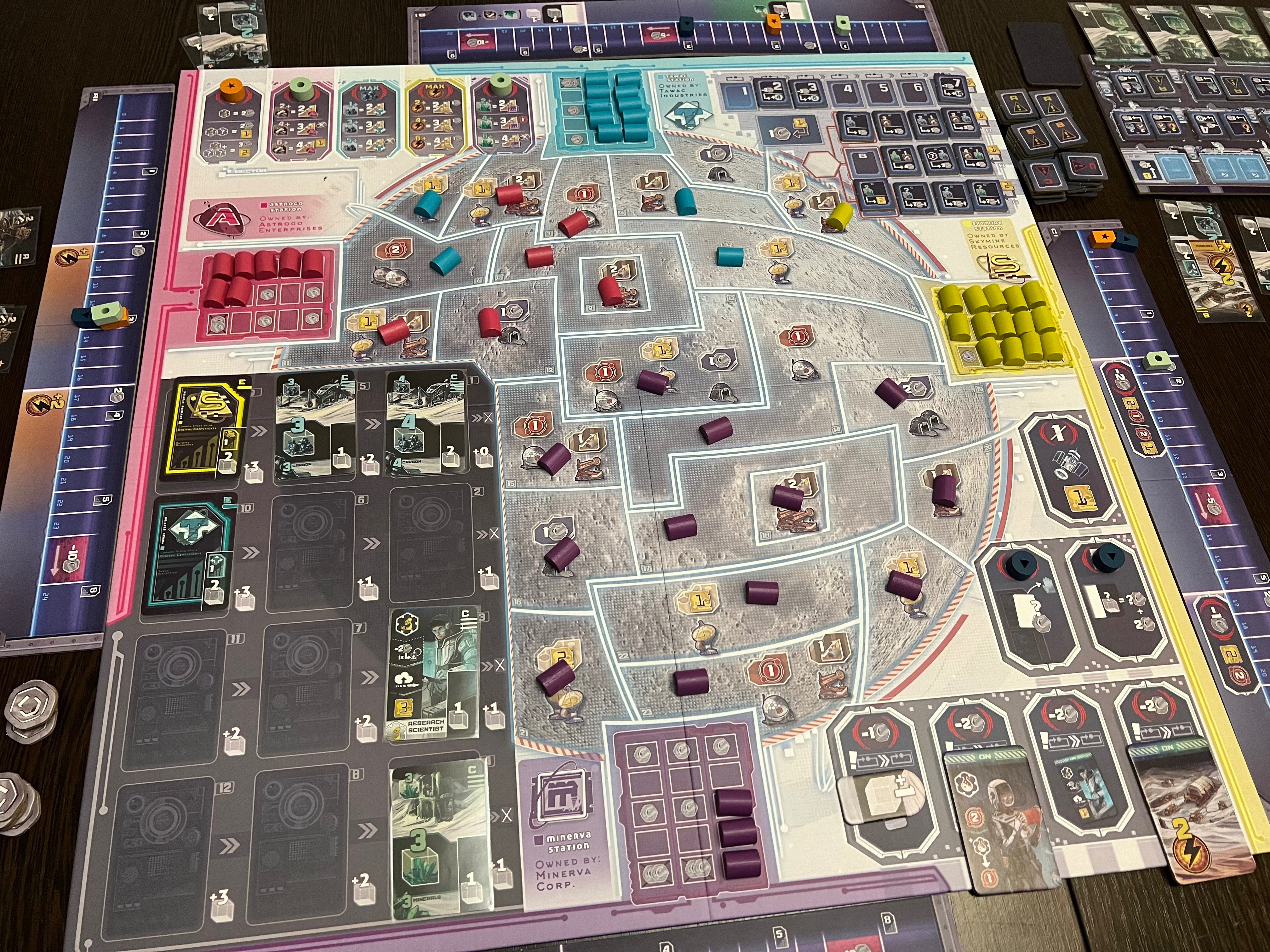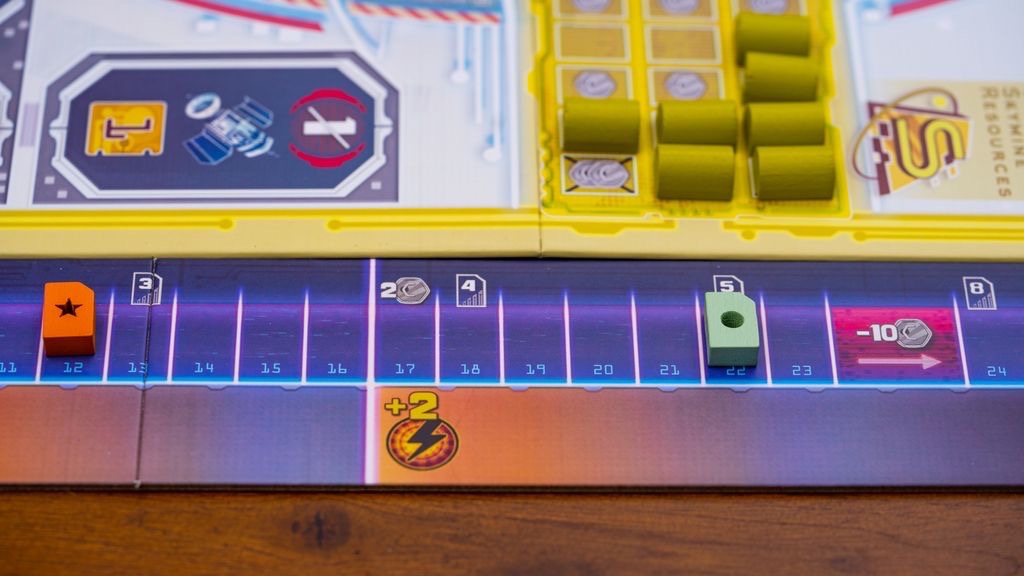 Можно двигаться в каждой из четырёх корпораций: продвижение даёт всё больше акций этой корпорации, а также доп плюшки (доп энергия, доп рабочих, доп ячейки действий для рабочих, скидка на покупку карт и пр).