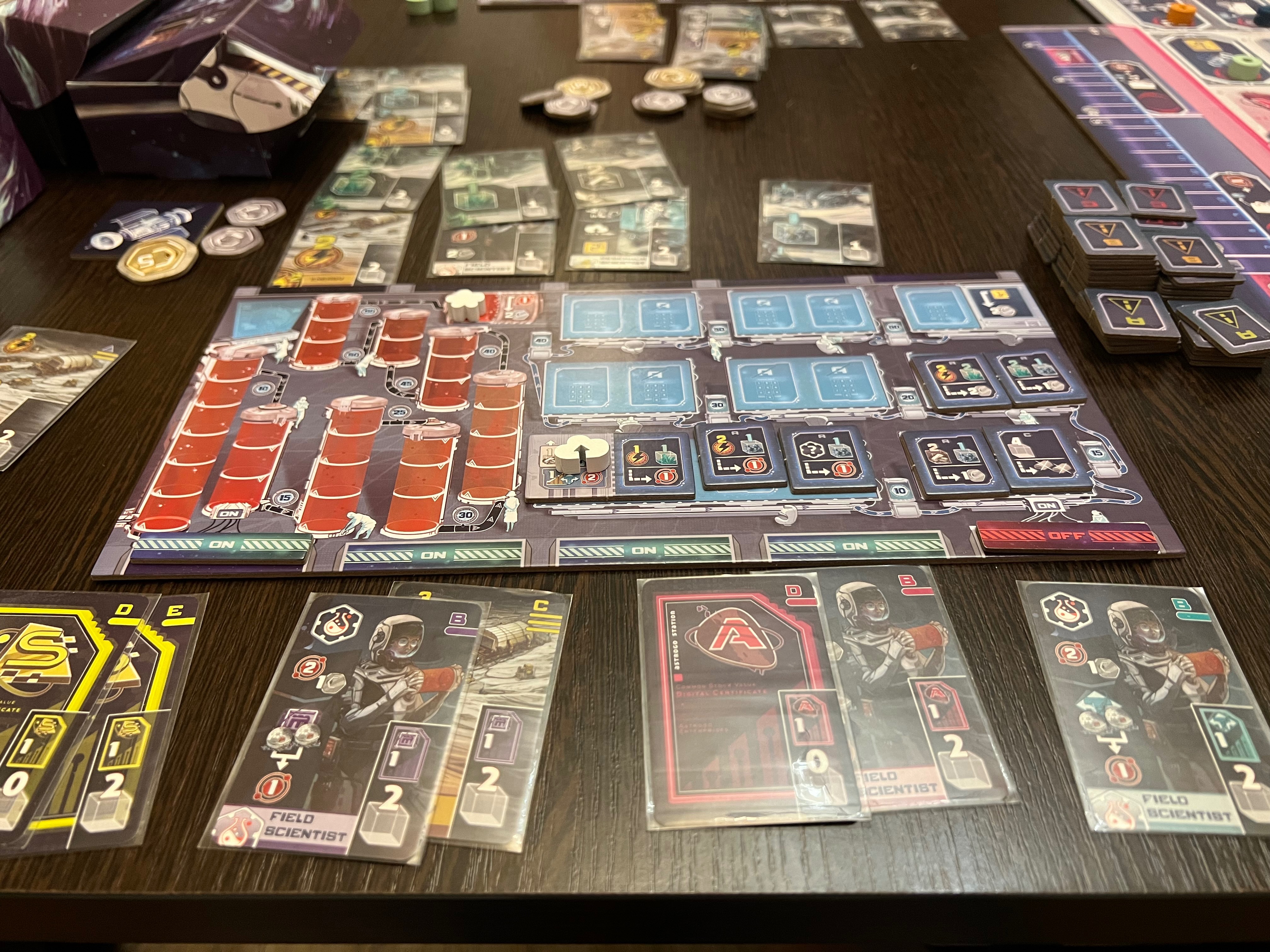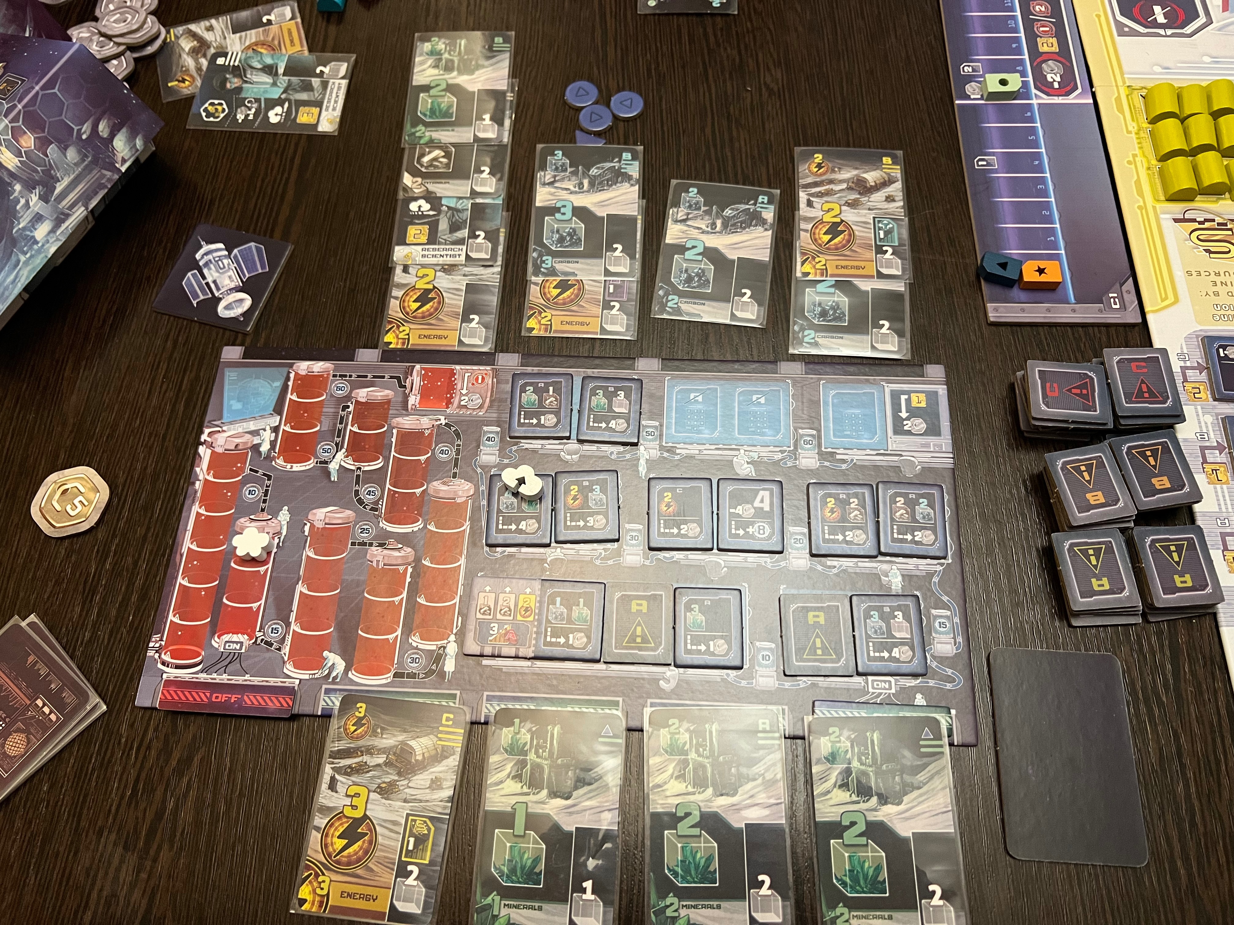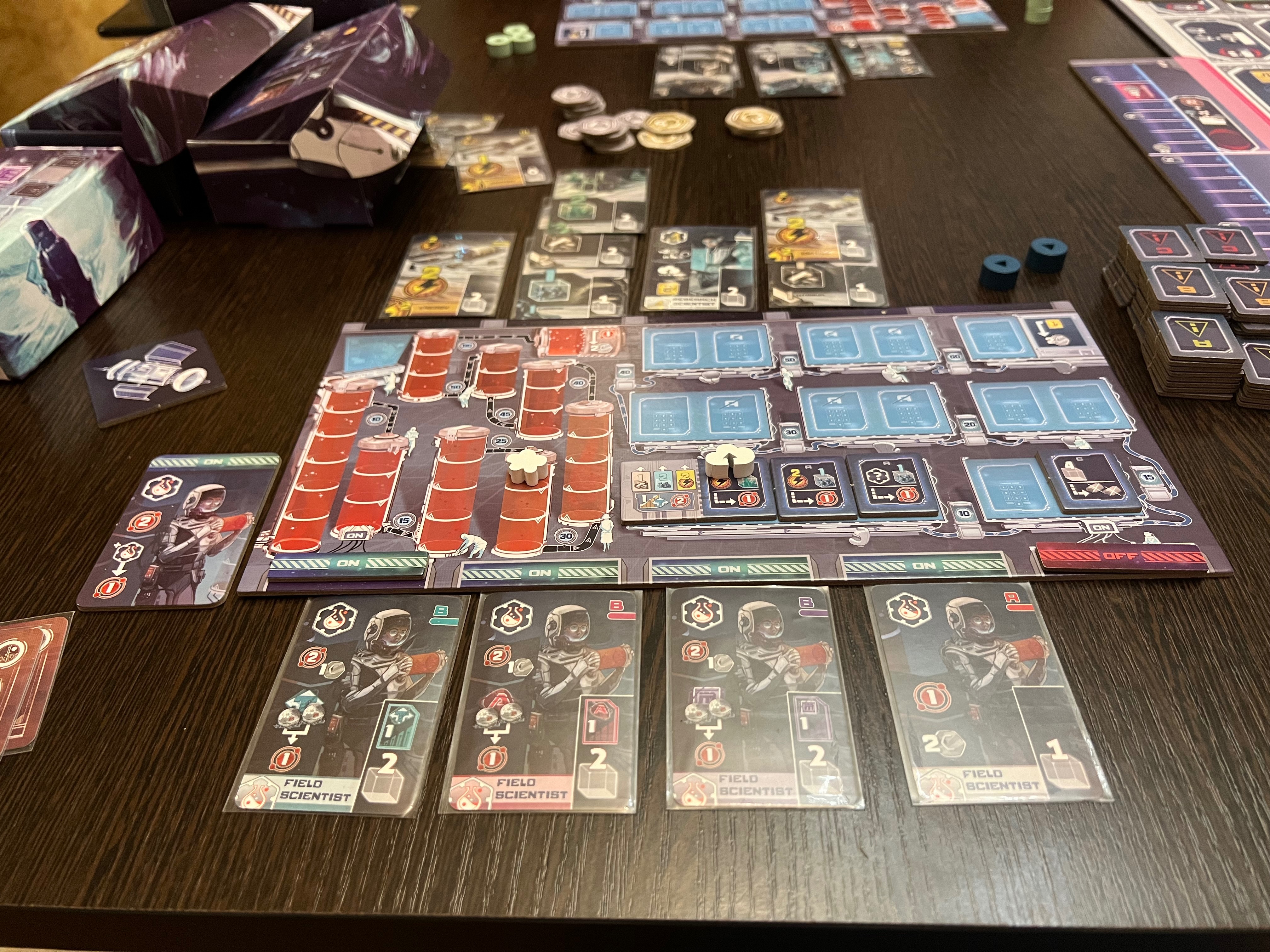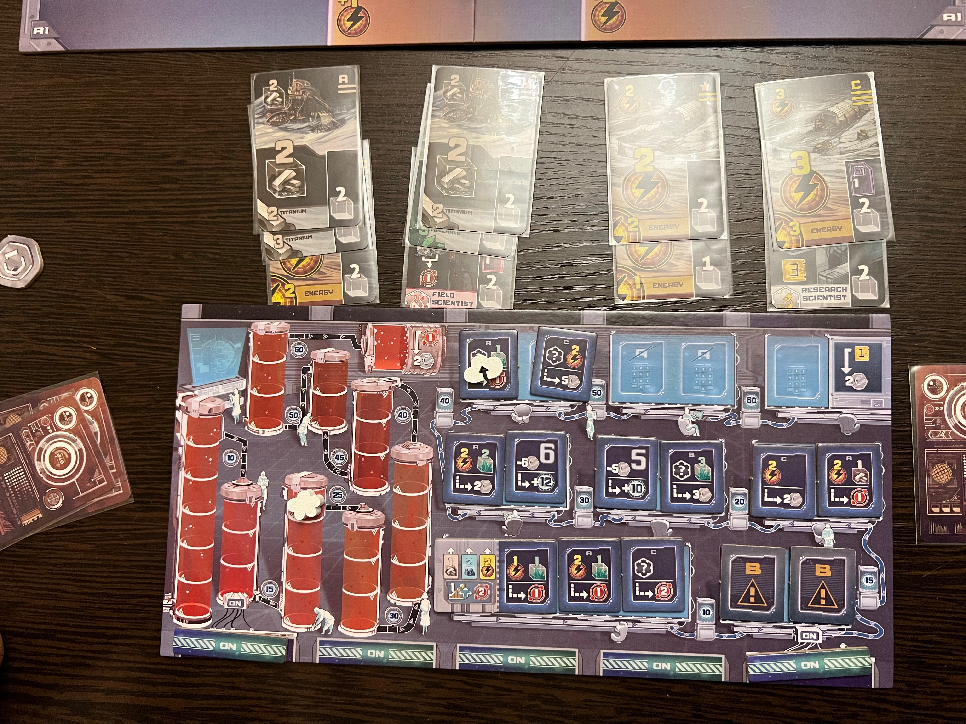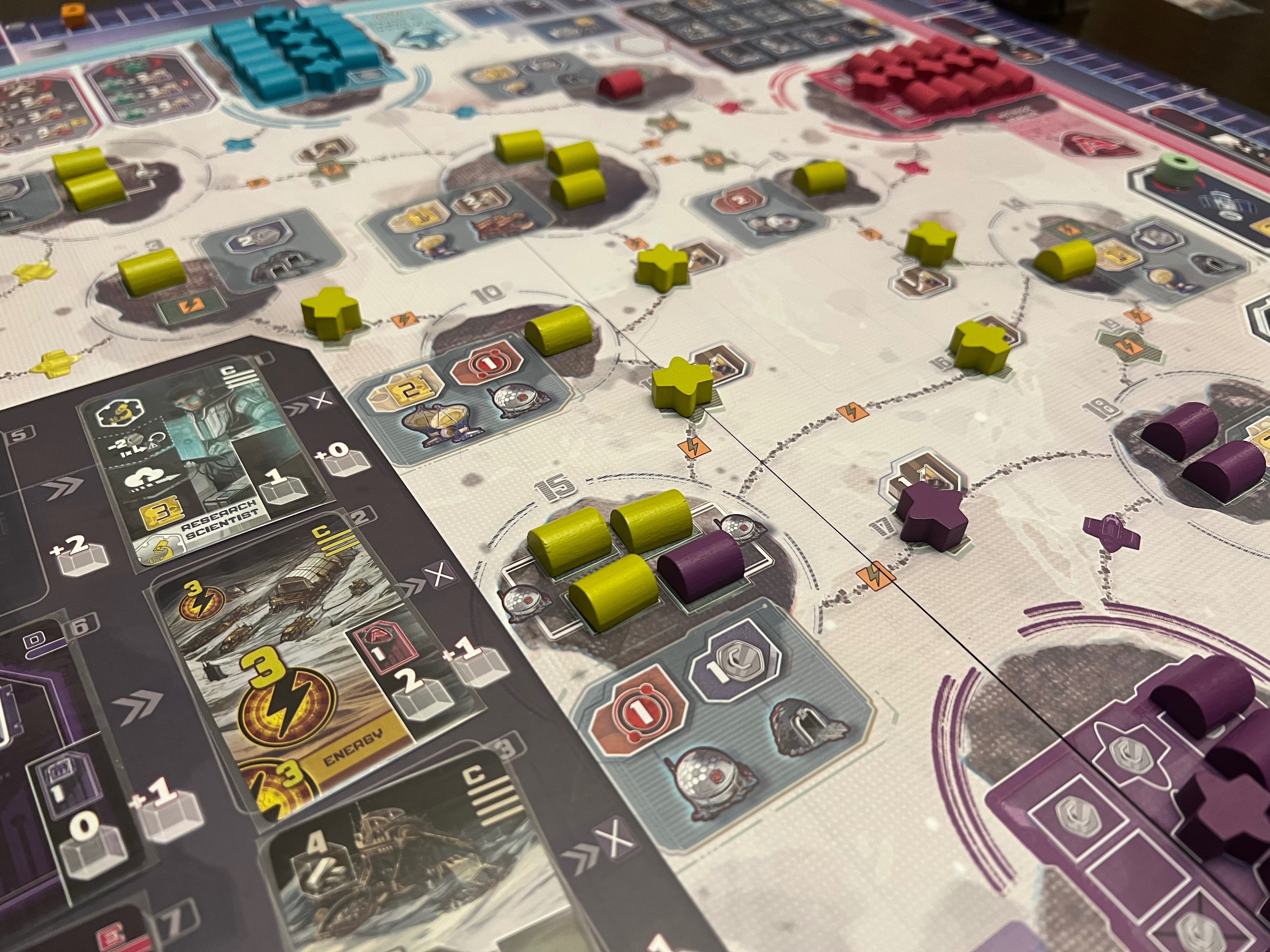Даётся всего 2 рабочих на раунд. Как бы мало, но на игровом поле не так уж и много ячеек. Есть ячейка для перехвата первого игрока (больше он никак не меняется). Есть ячейки для покупки доп исследователей, доп энергии или ресурсов на следующий раунд.