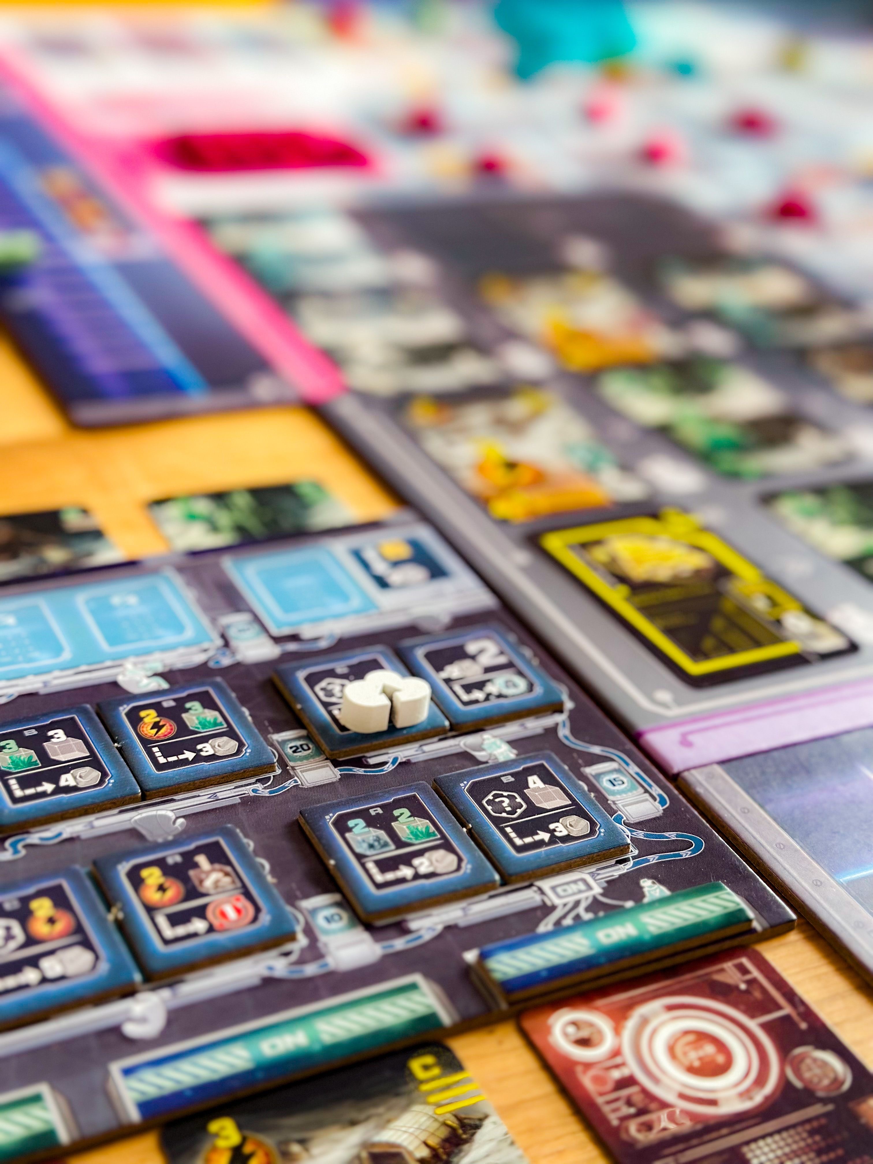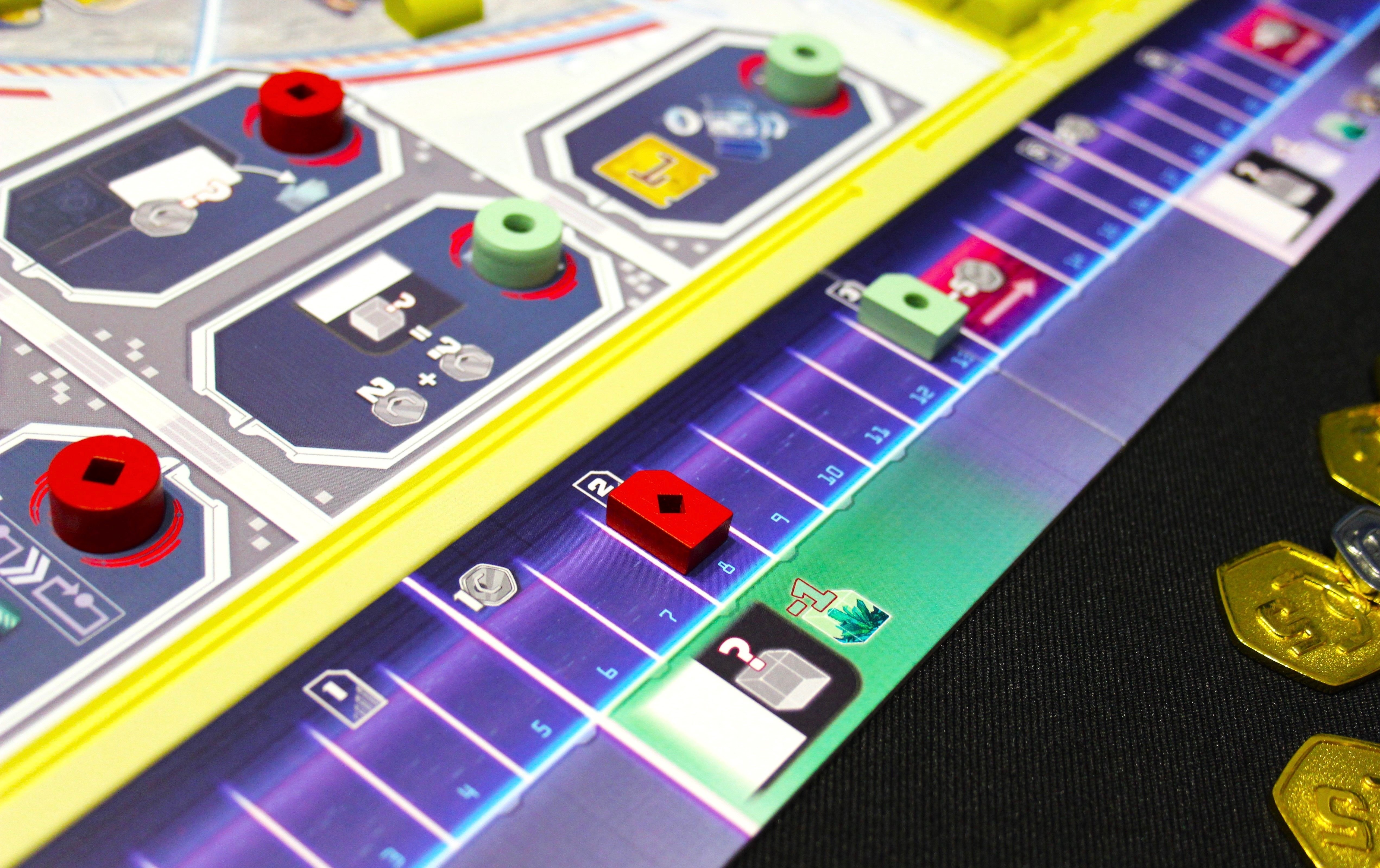 А можно двигаться по треку научных исследований (правая часть планшета). Тоже трудно: нужно сперва класть на трек жетоны микросхем с требованиями, а потом, если вы соответствуете этим требованиям (обычно это наличие карт в игровой зоне), - двигаетесь дальше.