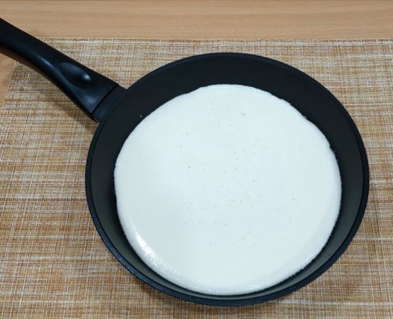 7. В сковороде небольшого диаметра (у меня 18 см) растопите кусочек сливочного масла и перелейте туда омлетную смесь.