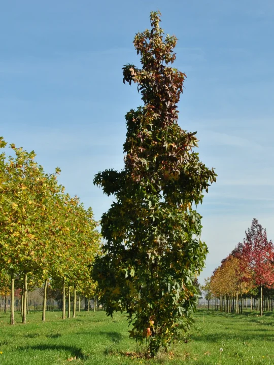 Liquidamber styraciflua 'Slender Silhouette': This beautiful variety of sweetgum, grows upwards of 60 feet tall, but its very tight, short branches mean the plant's spread is a mere 6 to 8 feet, making it a real standout in the landscape . The red fall color is spectacular, and it's fairly fast growing .