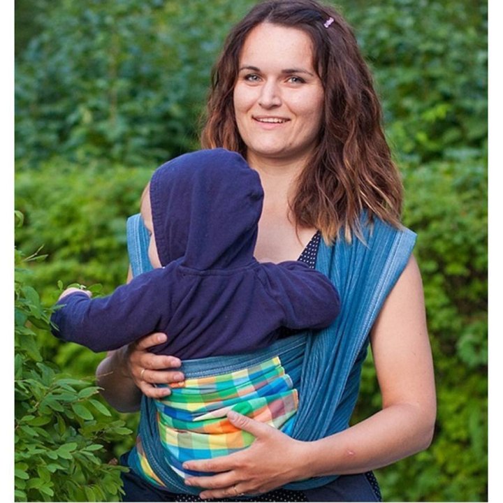слинг-шарф . Прямоугольник из ткани, размер: ширина - от 0,5 до 0,8 м, длина - от 2 до 6 м . Приспособление закрепляется на животе, спине или бедре .