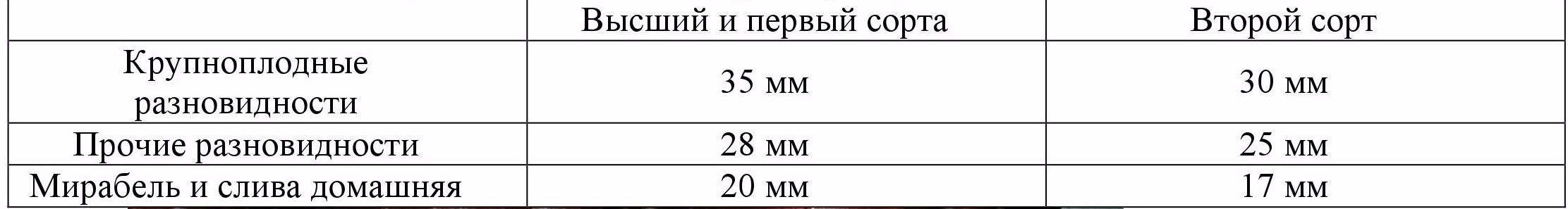 Калибровка производится по максимальному диаметру поперечного сечения. Для обеспечения однородности по размеру для высшего сорта, разница в размере между сливами в одной и той же упаковке не должна превышать 10мм.