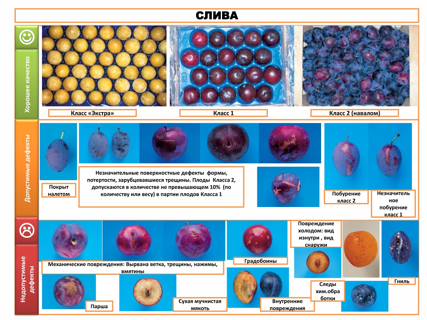 Сливы должны быть неповреждёнными, доброкачественными, чистыми, свежими, зрелыми (но не перезревшими), практически без насекомых-вредителей и практически без повреждений ими; с нормальной поверхностной влажностью; без постороннего запаха и/или привкуса; типичными по форме и окраске для заявленного сорта; однородными по степени зрелости.